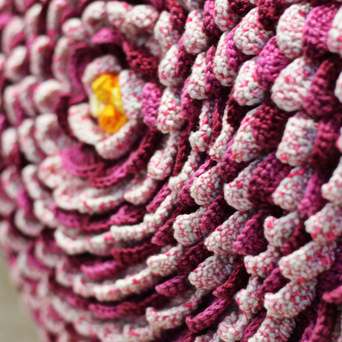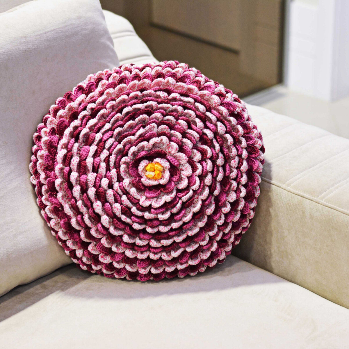 Подушечка с эффектным названием «Карибская чешуя». Не знаю, почему чешуя… мне это больше напоминает нежные цветочные лепестки. Та же хризантема, опять же. Ещё одна красивая цветочная модель, довольно затратная по пряже. Но красота требует жертв трат! Оборотную сторону можно связать как столбиками с накидом, так и теми же «лепестками», если не жалко пряжи. Оборотная сторона винно-розовая.