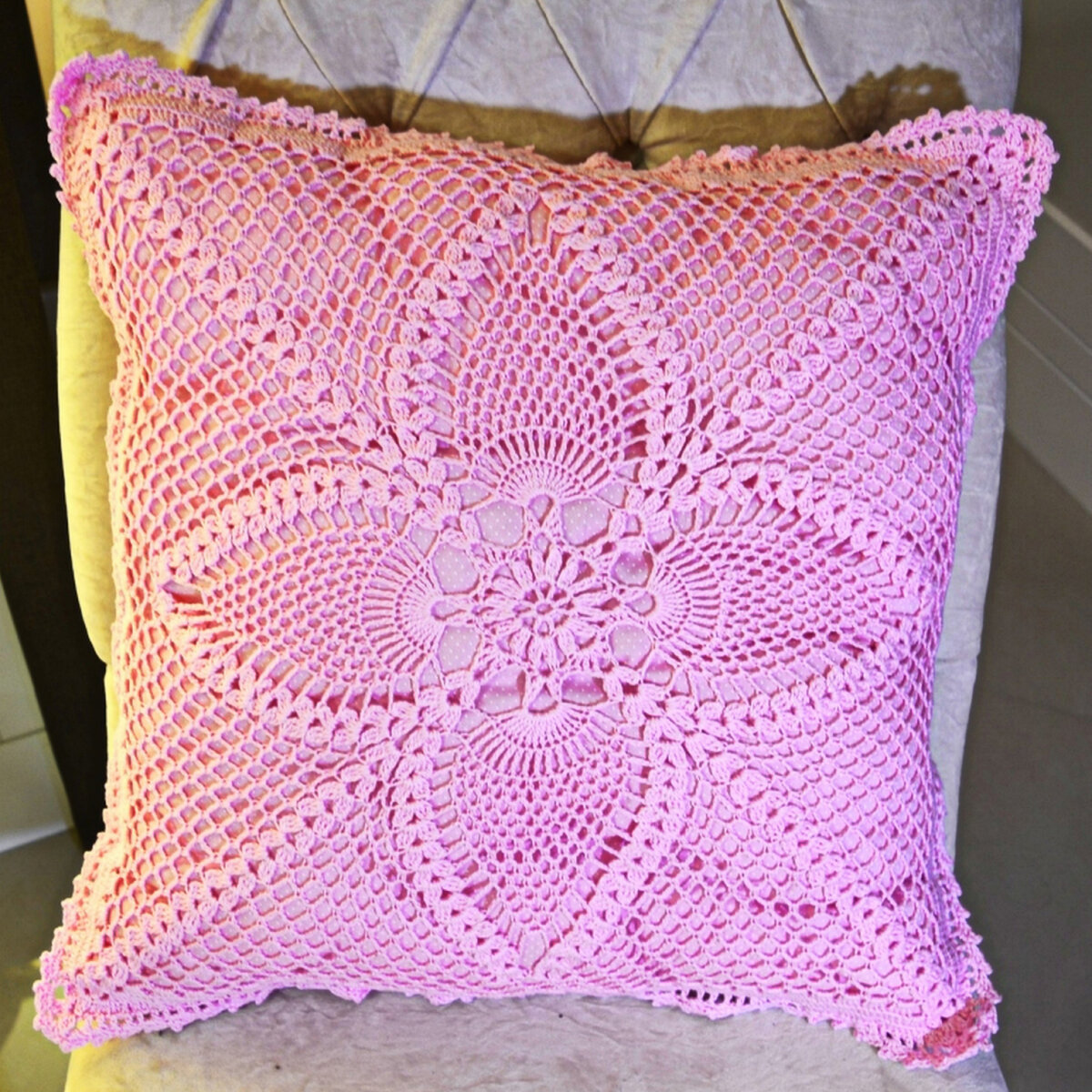 После объёмных цветочных моделей эта подушечка выглядит совсем уж просто… но от этого не менее красиво! А, главное, расход пряжи здесь умеренный, так как основной узор — это сетка. Такую подушечку можно связать за один вечер. Обе стороны вяжутся одинаково.