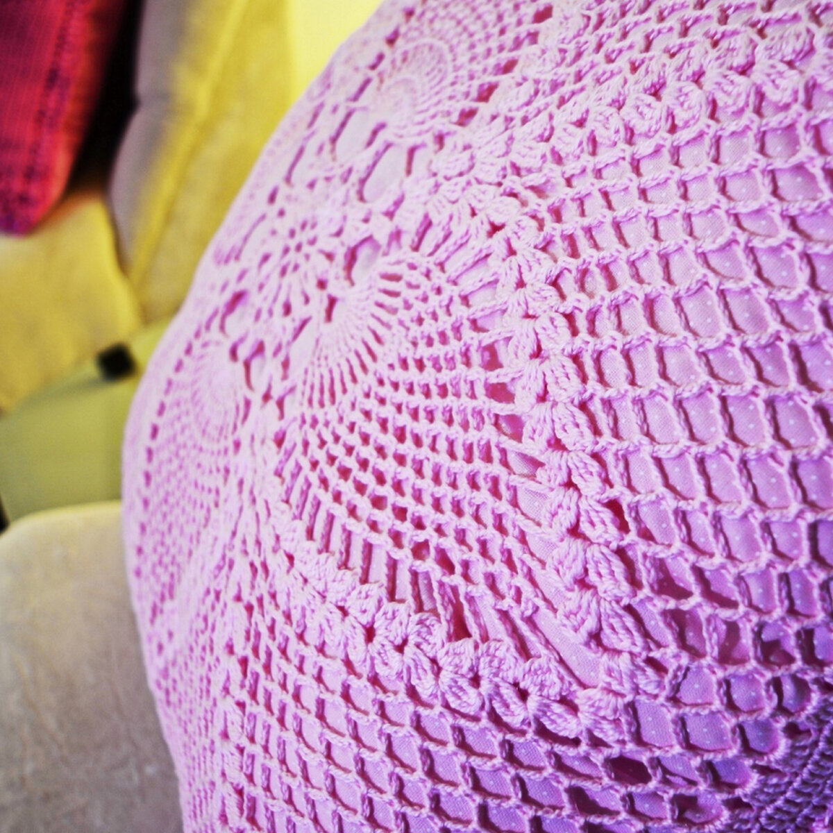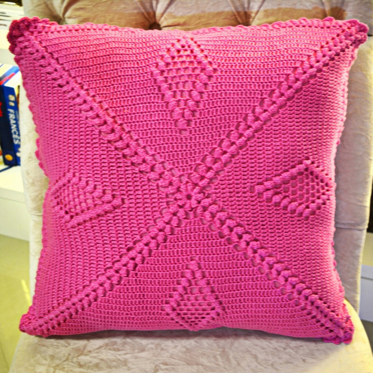 Ярко-розовая подушечка с простым узором — объёмные ромбы из «попкорна» на фоне столбиков с накидом. Обе стороны вяжутся одинаково.