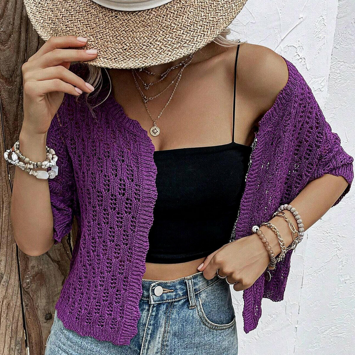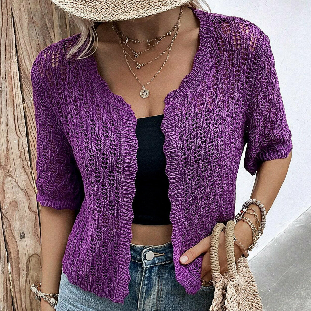 Ажурный фиолетовый кардиган от китайского бренда Shein. Стильная, слегка укороченная модель, которую можно связать спицами. Оригинальная волнистая отделка по низу, на манжетах и поперечной планке. Прямой силуэт до талии, широкий втачной рукав чуть выше локтя.