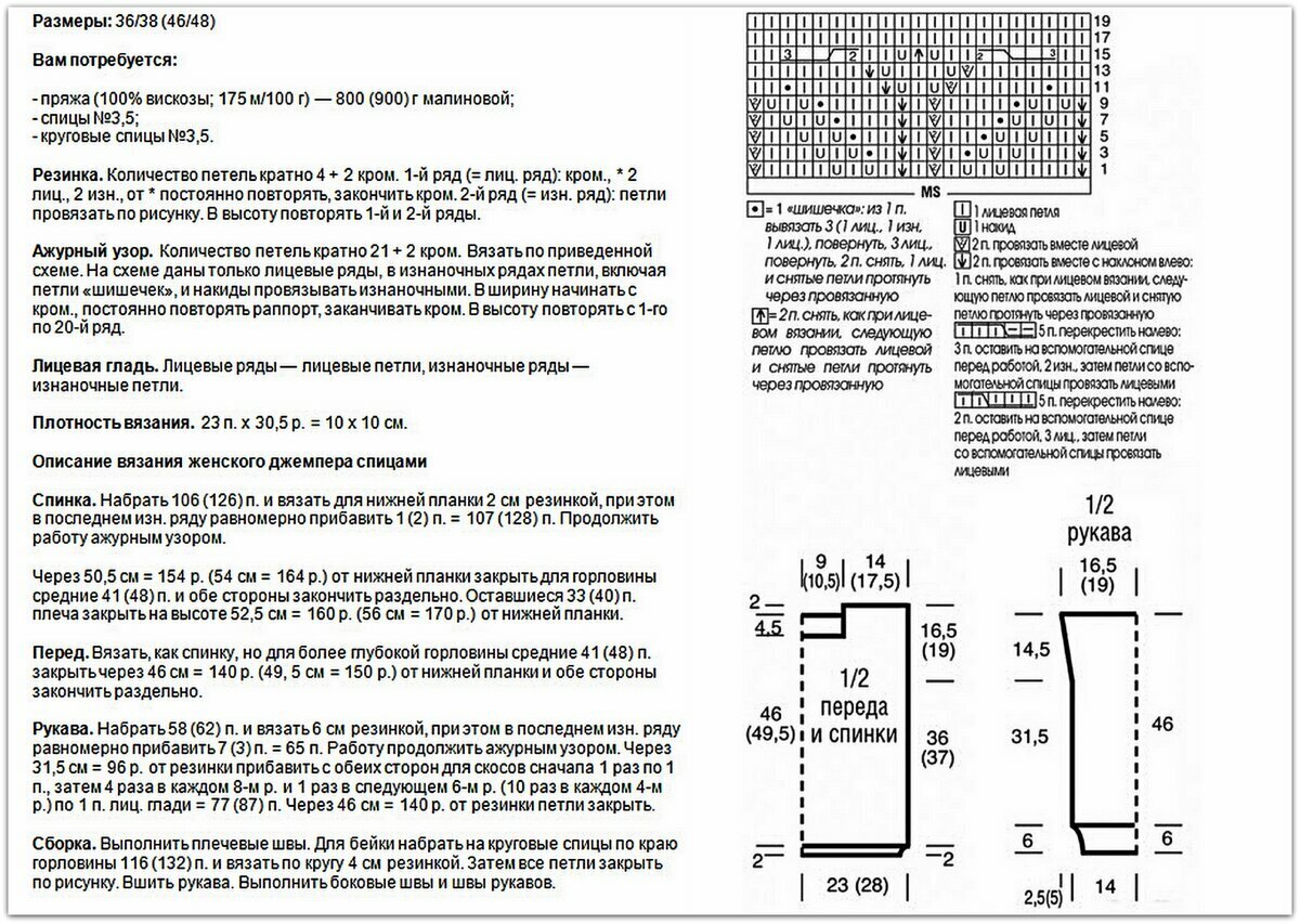 Для вязания этого джемпера нам понадобится 400 (450) 500 гр — на размеры 36/38 (42) 46/48 соответственно — пряжи цвета цикламена: 90% овечья шерсть, 10% кашемир; 50 гр — 160 м. Спицы № 3 и 3,5, а также круговые спицы № 3.