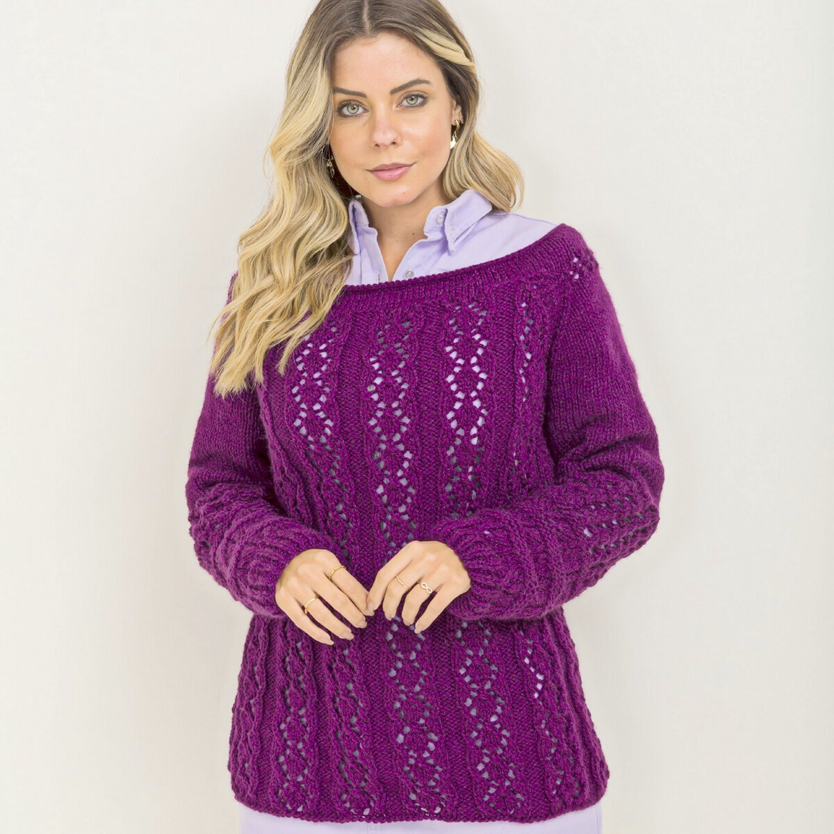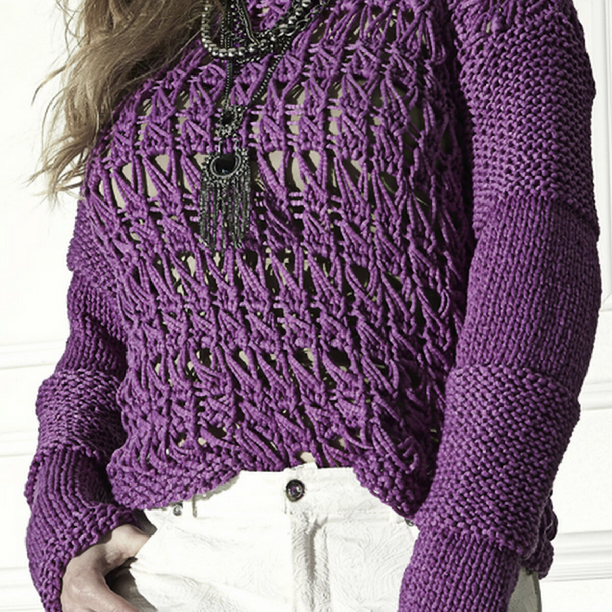 Сочный виноградный пуловер спицами с глубоким вырезом лодочкой. Удлинённый силуэт, объёмные рукава и разнообразие ажурных узоров.