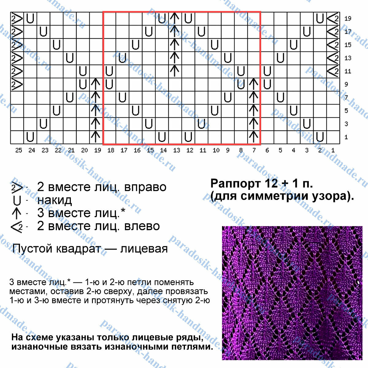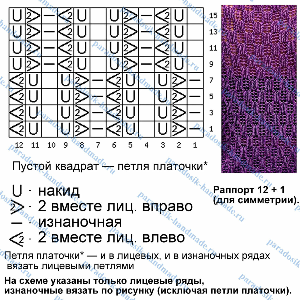 Раппорт узора 12 петель и 20 рядов в высоту. На схеме указаны только лицевые (нечётные) ряды, изнаночные (чётные) вязать изнаночными петлями.
