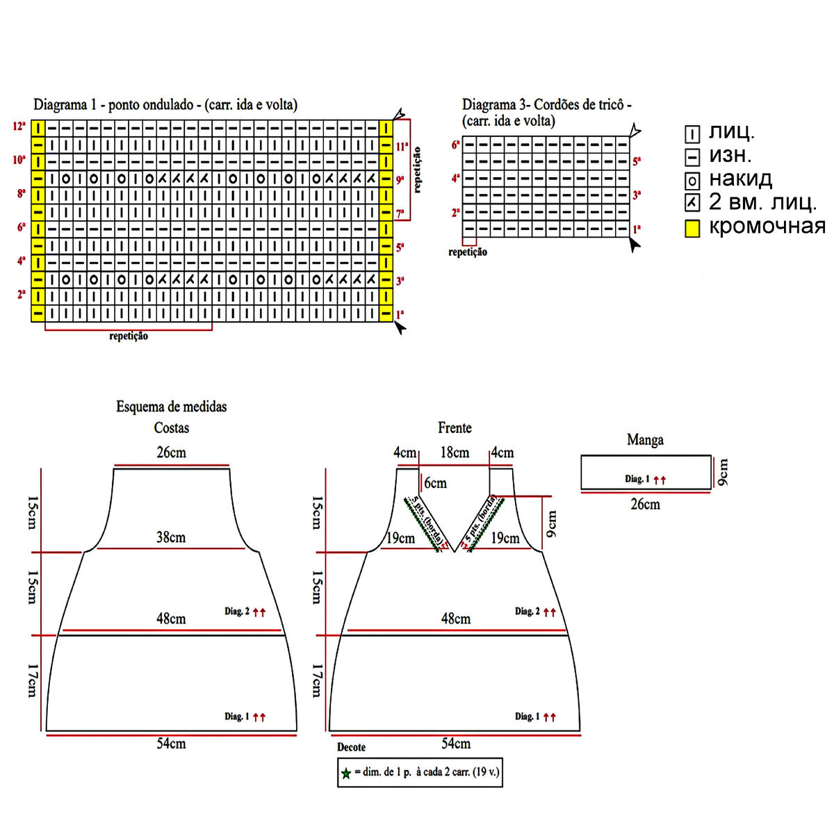 Раппорт узора 12 петель и 16 рядов в высоту. На схеме указаны только лицевые (нечётные) ряды, изнаночные (чётные) вязать по рисунку (исключая петли платочки — их во всех рядах лицевыми). Для поворотного вязания рекомендуется добавить ещё одну петлю к общему количеству раппортов — для красивой симметрии узора.