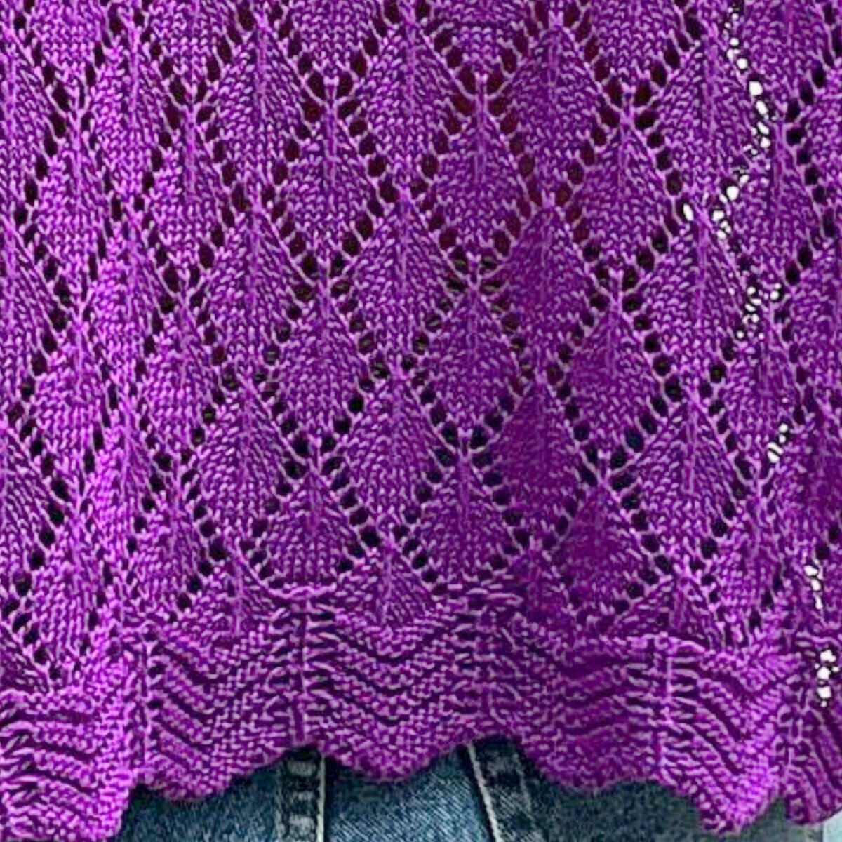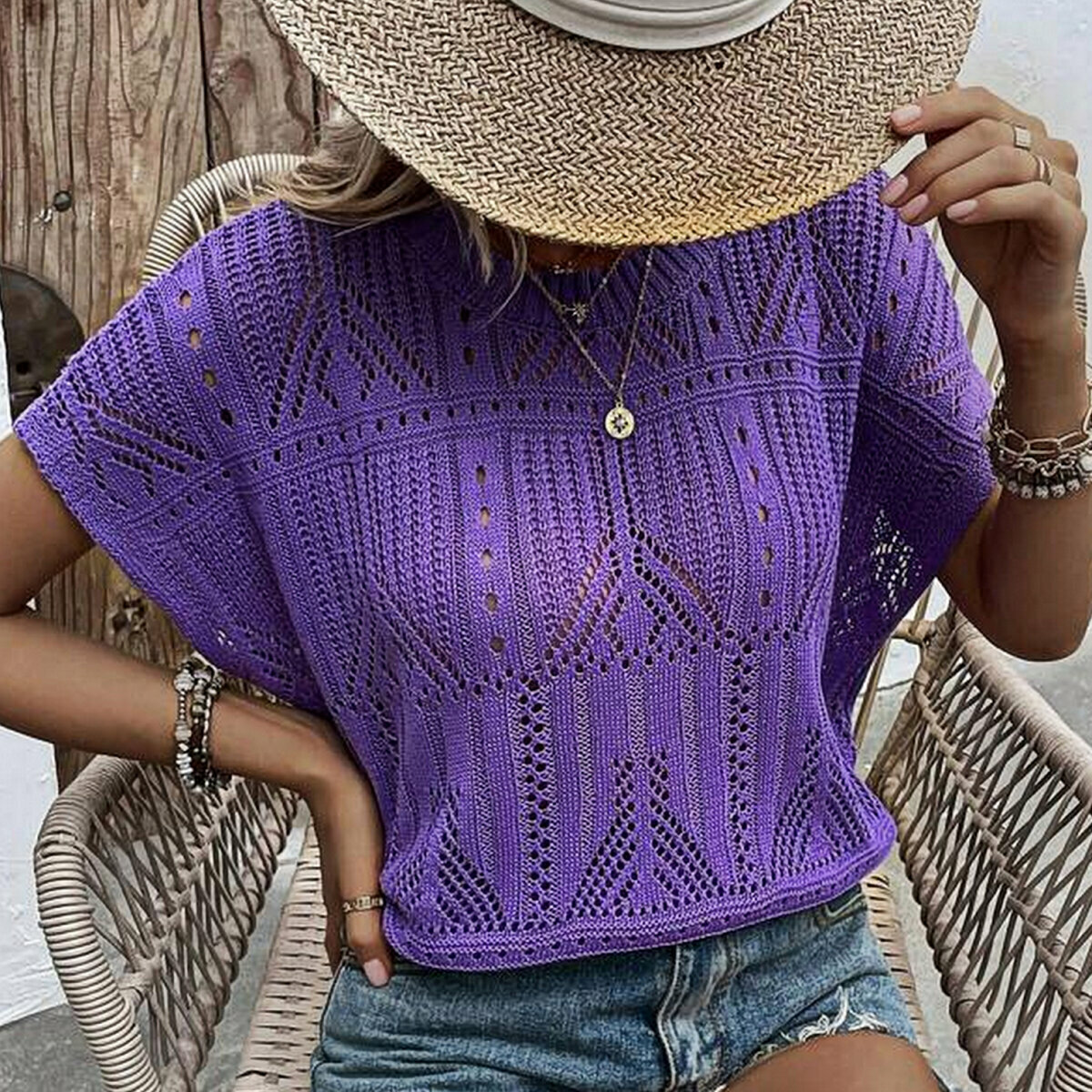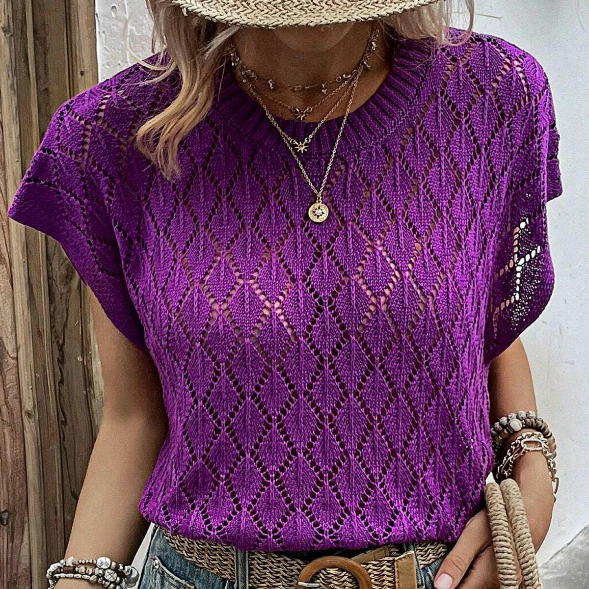 Чудесный фиалковый топ спицами от Shein. Простой фасон «наволочка» — модная и актуальная летняя модель оверсайз с несложным ажурным узором в виде ромбов и отделка по низу «шеврон».