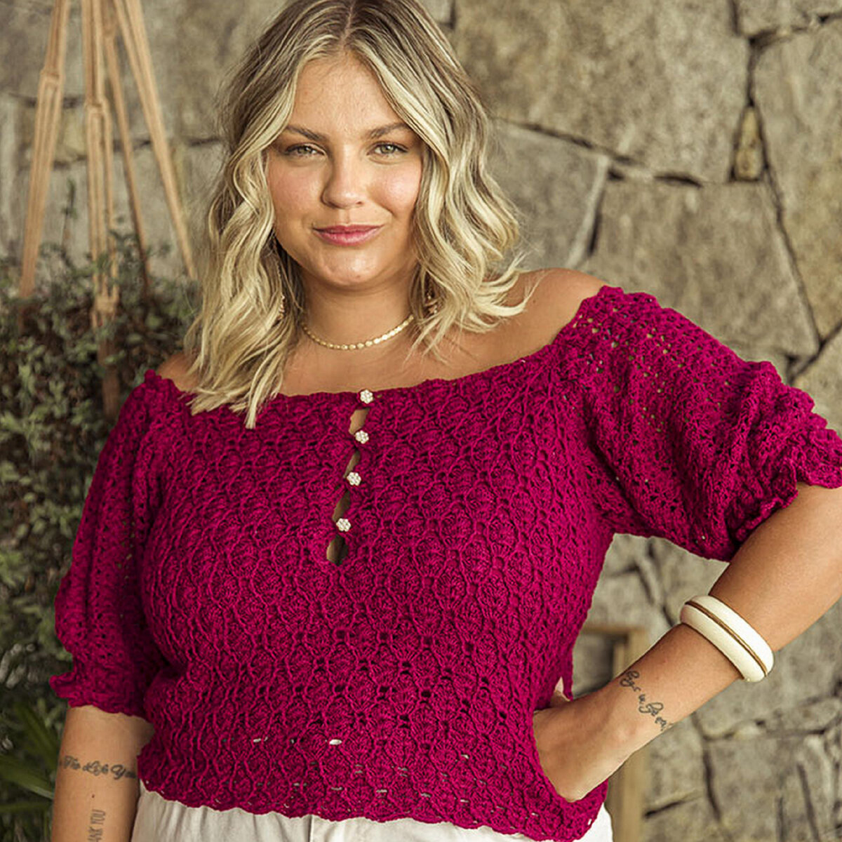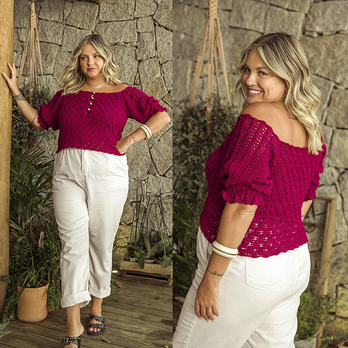 Фиолетово-розовая (да, фиолетового тут только намёк, но всё же!) блуза крючком. Цвет цикламен, если быть точнее. Я даже погуглила, в чём разница между цикламеном и фуксией: первый имеет розовый с уклоном в фиолетовый, второй — розовый с уклоном в красный. Нарядная модель цвета сочной ягоды — укороченный фасон, широкие рукавчики до локтя и ворот, застёгивающийся на крохотные цветочные пуговки.