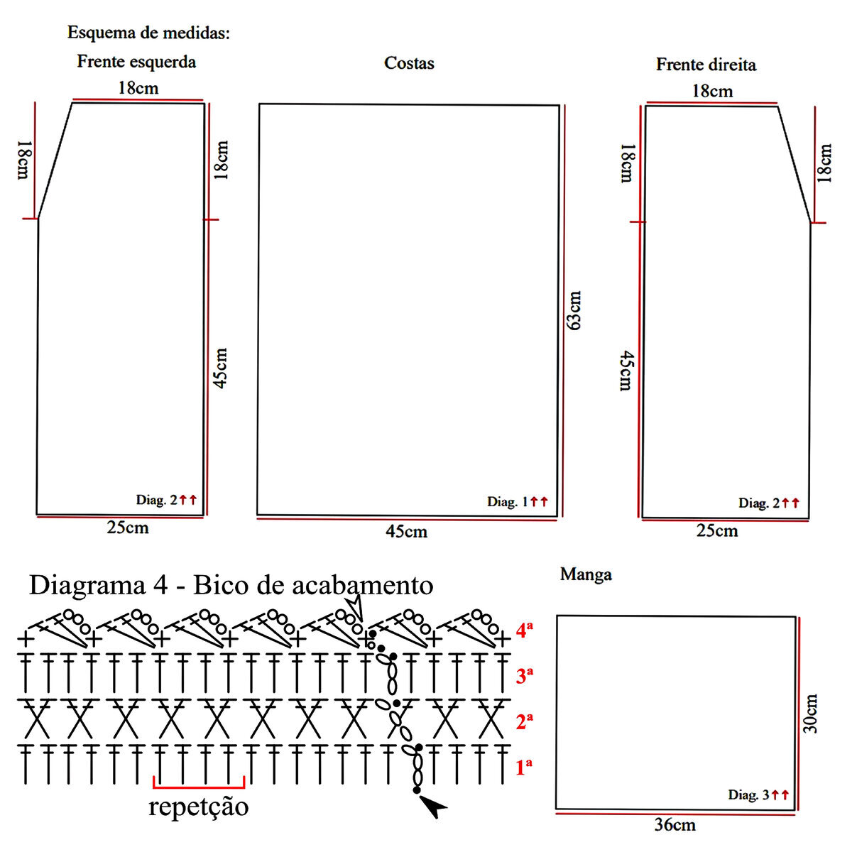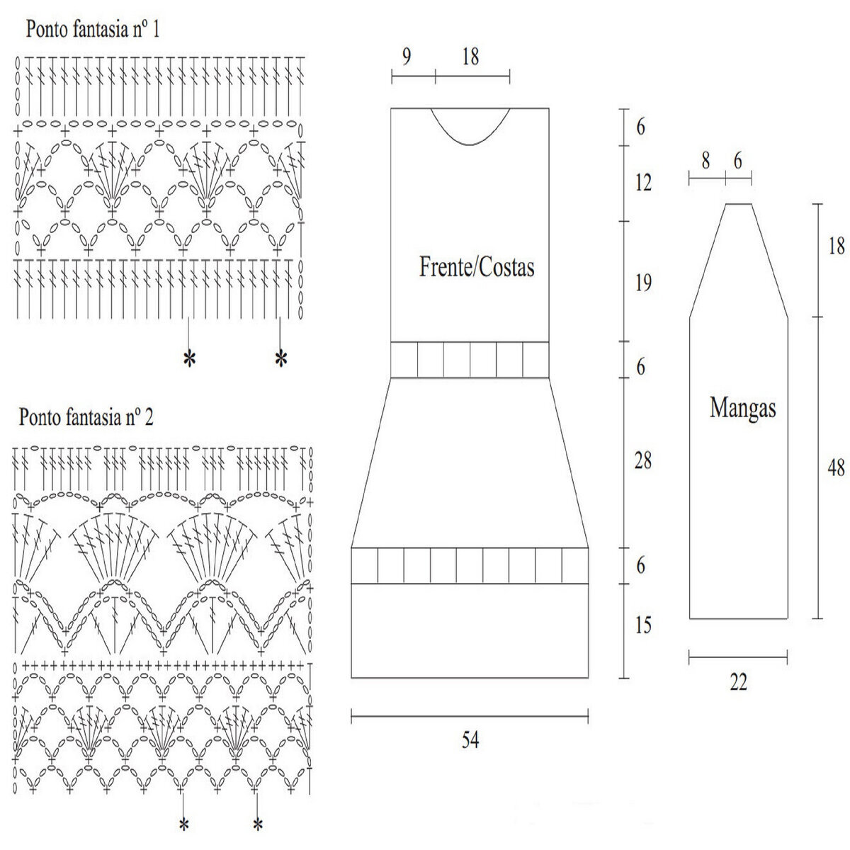 Топ вяжется квадратом из двух деталей (перед и спинка), в два раза шире нужного нам размера (можно даже в три — смотря насколько свободные фасоны вы любите), без убавлений под проймы — за счёт большого размера у нас получится широкий спущенный рукавчик (можно связать плечевой скос, если вы опытная вязальщица и вам идут именно покатые плечи). Убавления делаем только на передней детали — для небольшого круглого выреза горловины. Вяжем снизу вверх, начиная с отделки «шеврон» и затем переходя к основному ажурному узору «ромбы». Отделка горловины — резинка 2 х 2 (2 лицевые, 2 изнаночные).