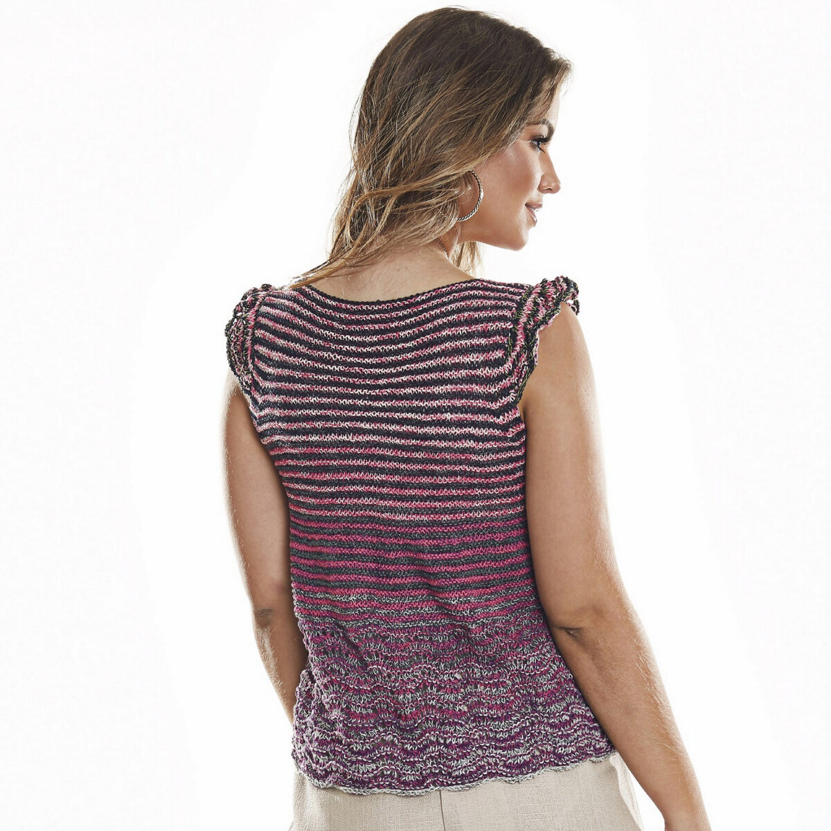 Для этой модели даже не нужен какой-то ажур, хотя узор по низу играет на руку фасону. Всё, что нам необходимо — это найти пряжу с короткими секциями. Благо, сейчас есть много таких полосатых вариантов! Симпатичный топ спицами в серо-бордово-фиолетовую полоску. Расклешенный фасон, рукава-крылышки и глубокий V-образный вырез горловины.