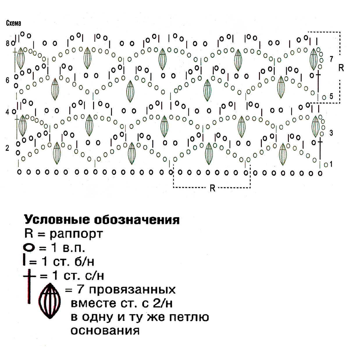Для красивой симметрии узора рекомендуется добавить ещё 6 петель к общему количеству раппортов и заканчивать ряд петлями, указанными после раппорта.