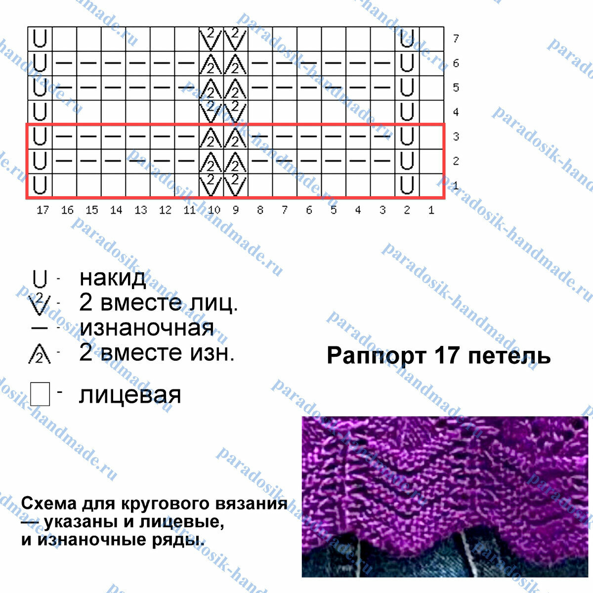 Раппорт узора 17 петель и всего 3 ряда в высоту. Обратите внимание, что схема для кругового вязания — указаны и лицевые (нечётные), и изнаночные (чётные) ряды.