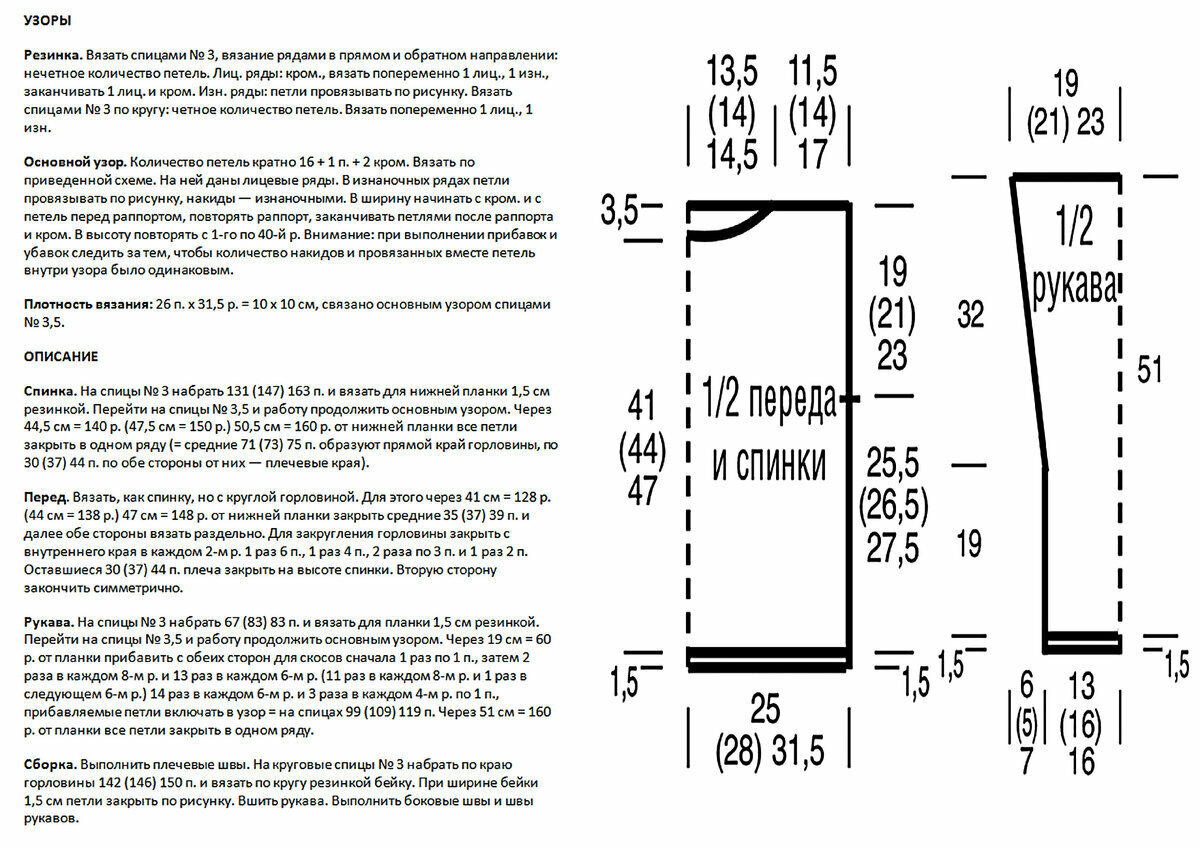 Отделка по низу и на горловине — резинка 2 х 2 (2 лицевые, 2 изнаночные). Для пройм, имитирующих широкий спущенный рукавчик, можно добавить по краям деталей около 6 петель и вязать резинкой 1 х 1, платочкой, рисовой путанкой либо резинкой из снятых лицевых — такая отделка не даст заворачиваться краям.