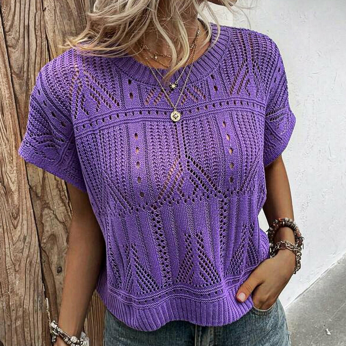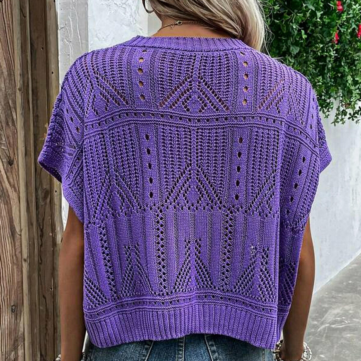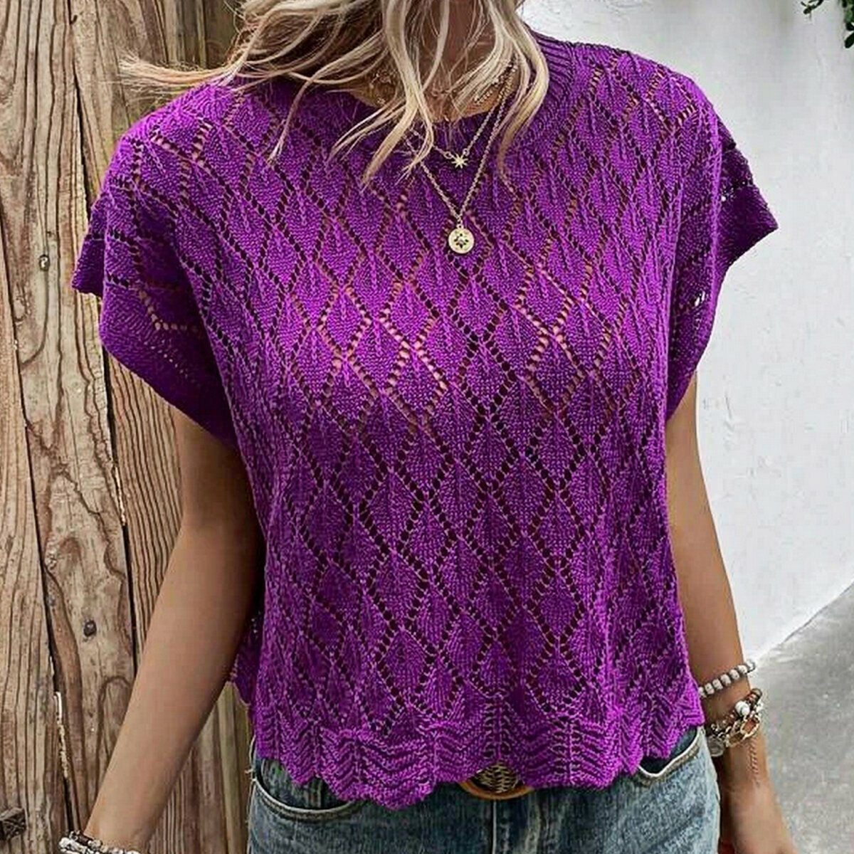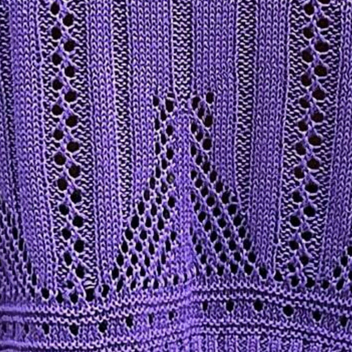 Чудесный фиалковый топ спицами от Shein. Простой фасон «наволочка» — модная и актуальная летняя модель оверсайз с несложным ажурным узором в виде ромбов и отделка по низу «шеврон».