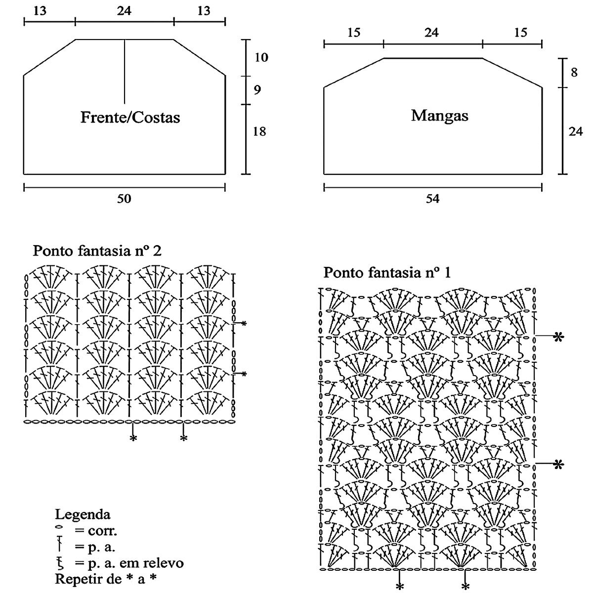 Топ вяжется квадратом из двух деталей (перед и спинка), в два раза шире нужного нам размера (можно даже в три — смотря насколько свободные фасоны вы любите), без убавлений под проймы — за счёт большого размера у нас получится широкий спущенный рукавчик (можно связать плечевой скос, если вы опытная вязальщица и вам идут именно покатые плечи). Убавления делаем только на передней детали — для небольшого круглого выреза горловины. Вяжем снизу вверх, начиная с отделки «шеврон» и затем переходя к основному ажурному узору «ромбы». Отделка горловины — резинка 2 х 2 (2 лицевые, 2 изнаночные).