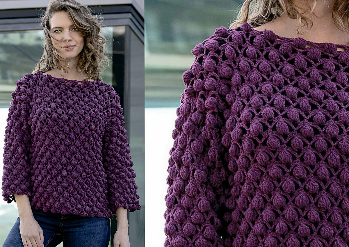 Оригинальная объёмная модель из журнала Burda — стильный тёмно-фиолетовый джемпер крючком с узором из крупных шишечек. Хоть я и очень люблю такие объёмные узоры, всё же шишечки б делала поменьше — они добавляют не только объёма (и веса) изделию, но ещё и объёма фигуре. На очень худеньких девочках будет смотреться хорошо, а вот на девушке с формами… В любом случае, идея интересная.