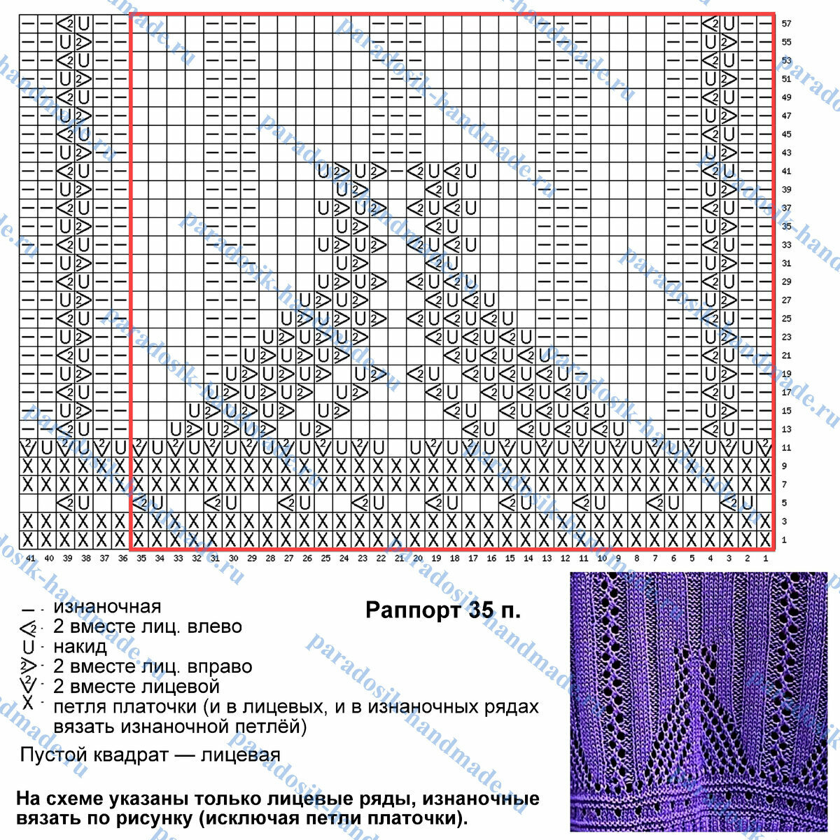 Раппорт узора 35 петель и 58 рядов в высоту. На схеме указаны только лицевые (нечётные) ряды, изнаночные (чётные) вязать по рисунку, исключая петли платочки (и в лицевых, и в изнаночных рядах вяжем изнаночными петлями).