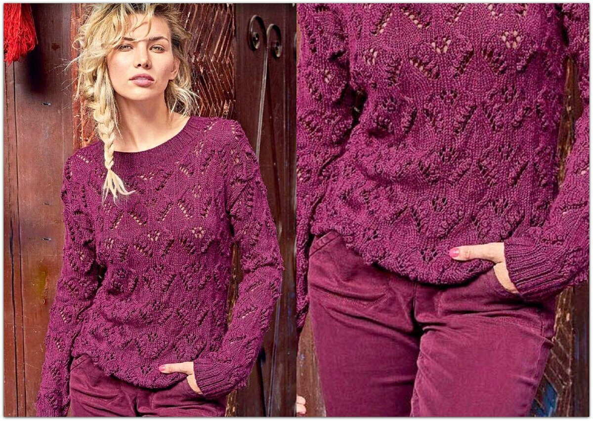 Сочный виноградный пуловер спицами с глубоким вырезом лодочкой. Удлинённый силуэт, объёмные рукава и разнообразие ажурных узоров.