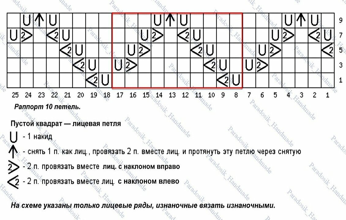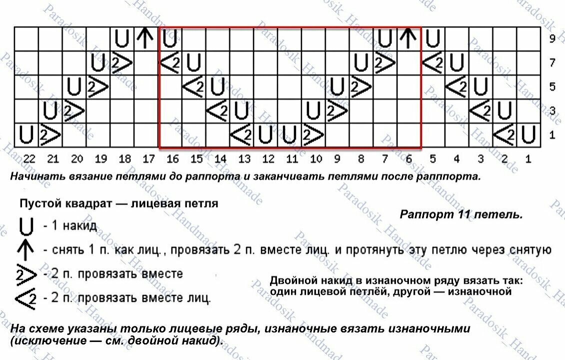 Раппорт ажурного узора 9 петель и 6 рядов в высоту. На схеме указаны и лицевые (нечётные), и изнаночные (чётные) ряды. Изнаночные ряды можно опустить и вязать их просто по рисунку.
