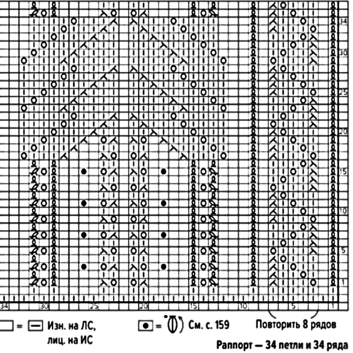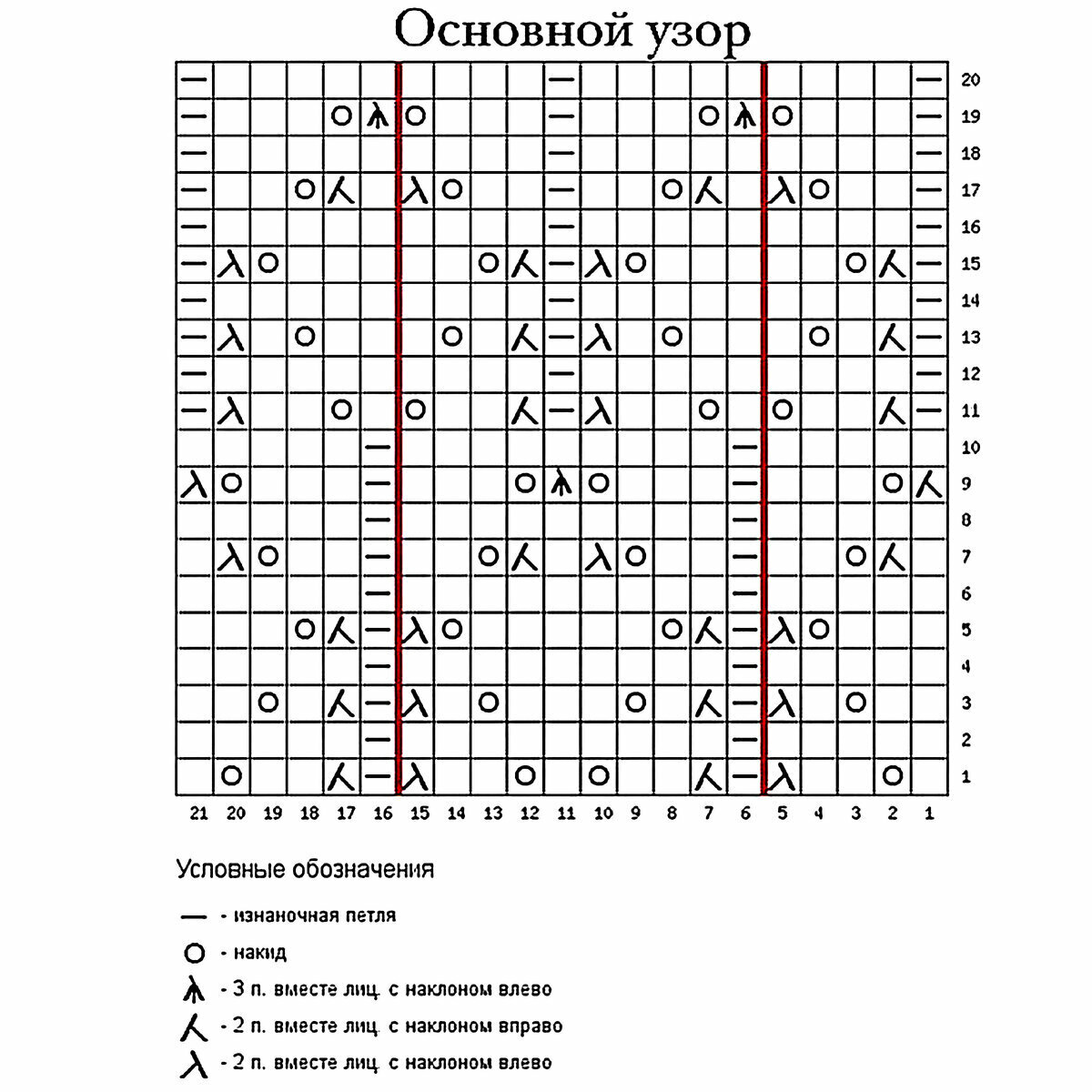 Раппорт узора 18 петель и 28 рядов в высоту. На схеме указаны только лицевые (нечётные) ряды, изнаночные (чётные) вязать изнаночными петлями. Для красивой симметрии узора рекомендуется добавить ещё одну петлю к общему количеству раппортов.