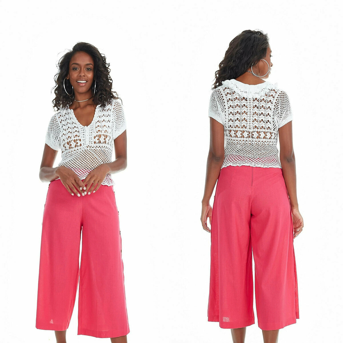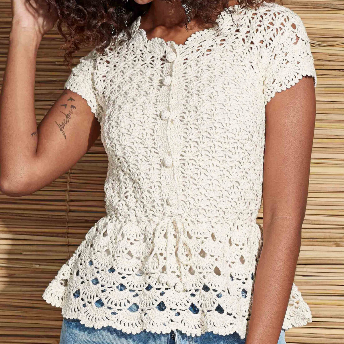 Модный белоснежный кроп-топ на пуговичках с простым узором «ракушки». Идеально подойдёт под летние брючки или джинсы с завышенной талией, которые снова актуальны в этом сезоне.