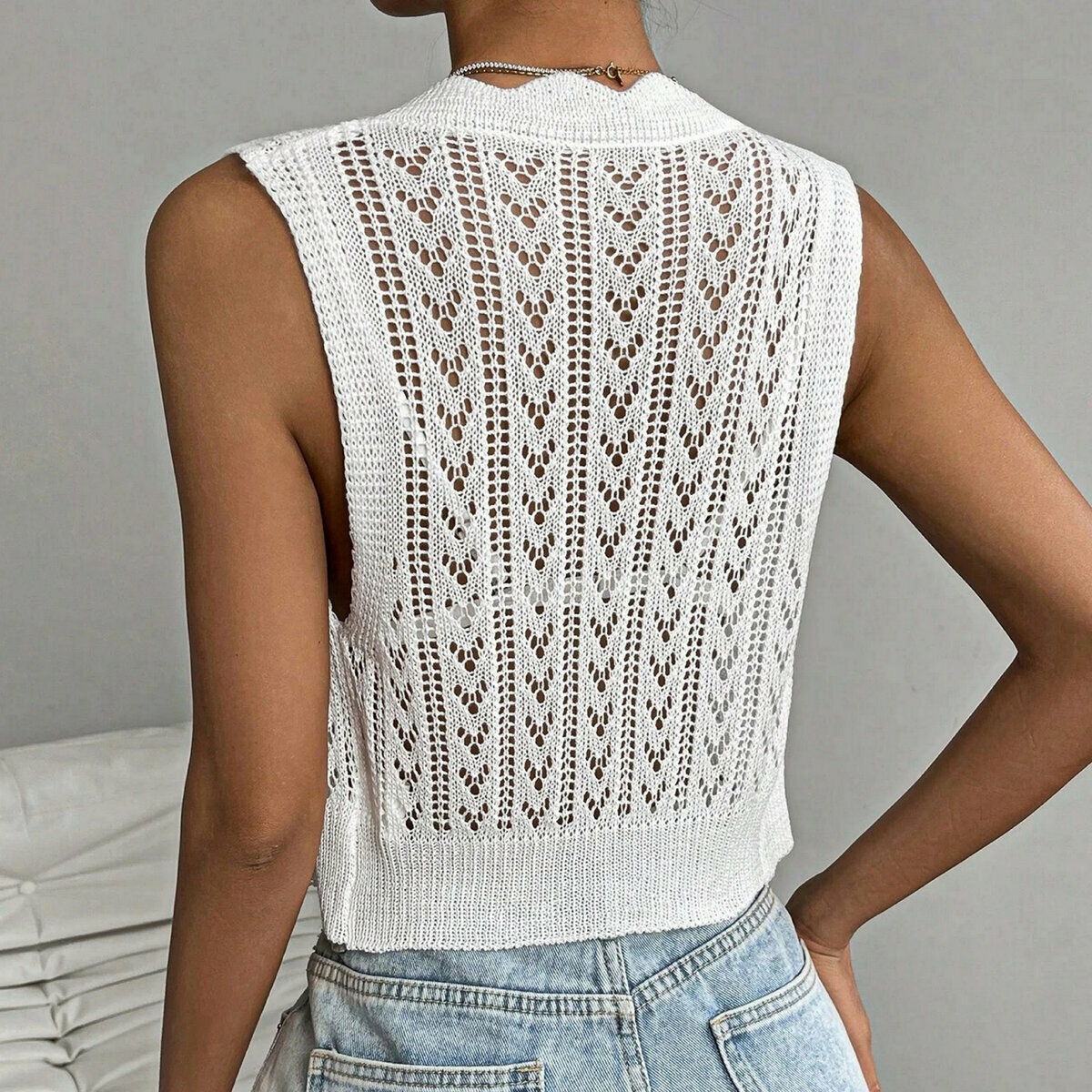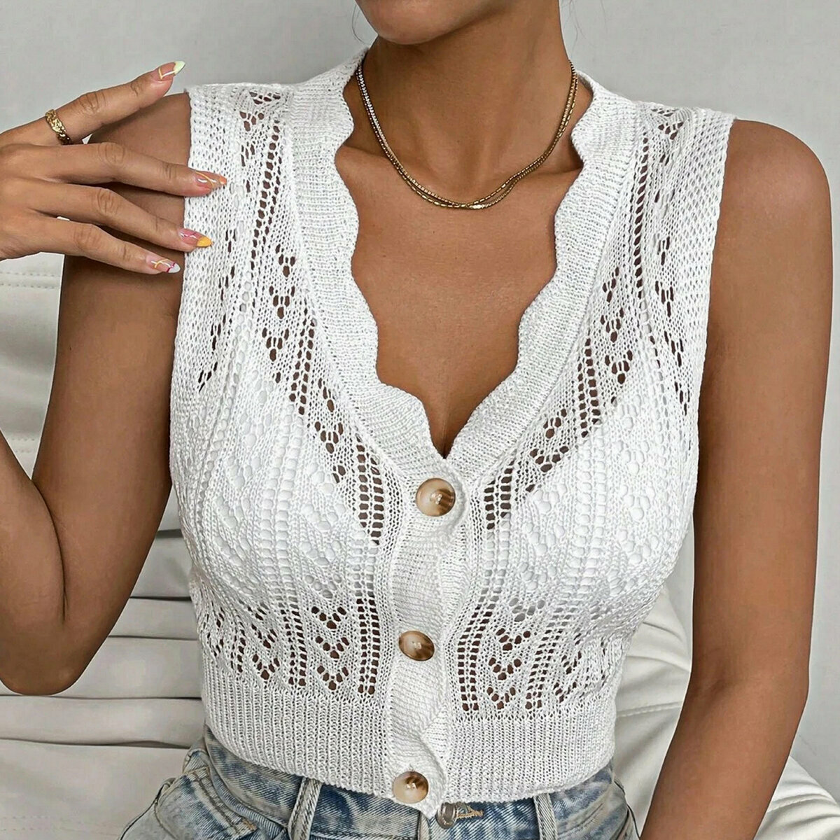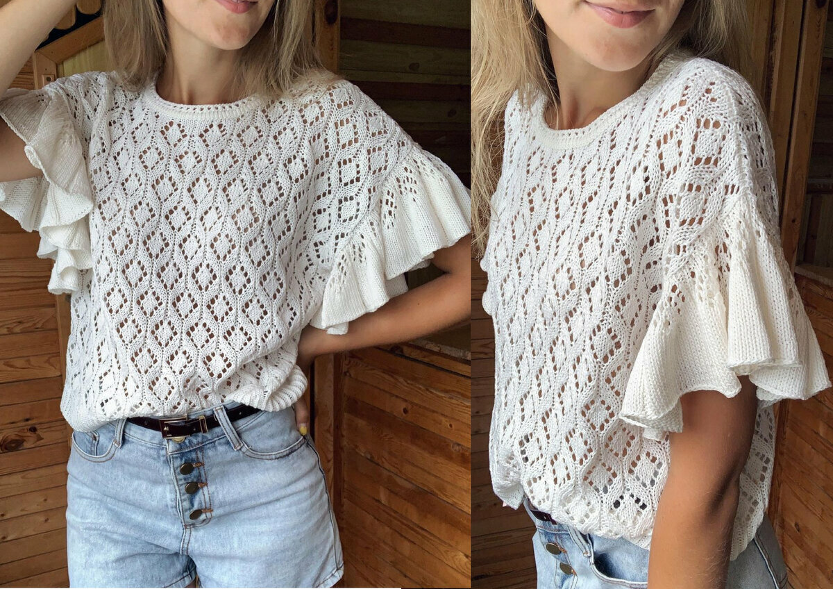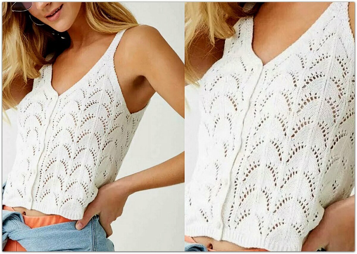 Белоснежный топ на пуговицах — ещё один вариант от Shein, который я подробно разбирала и составляла схему узора. Укороченная модель без рукавов. Внизу топ плотно облегает талию за счёт резинки, основная часть оформлена простым ажурным узором из галочек и дорожек. Главная изюминка данной модели — фестончатая кайма-планка.
