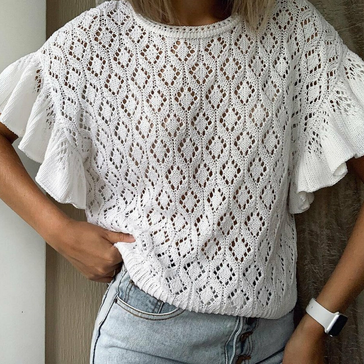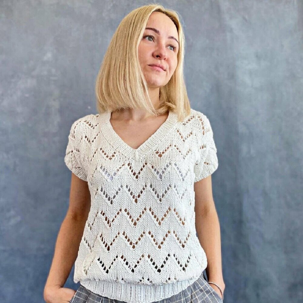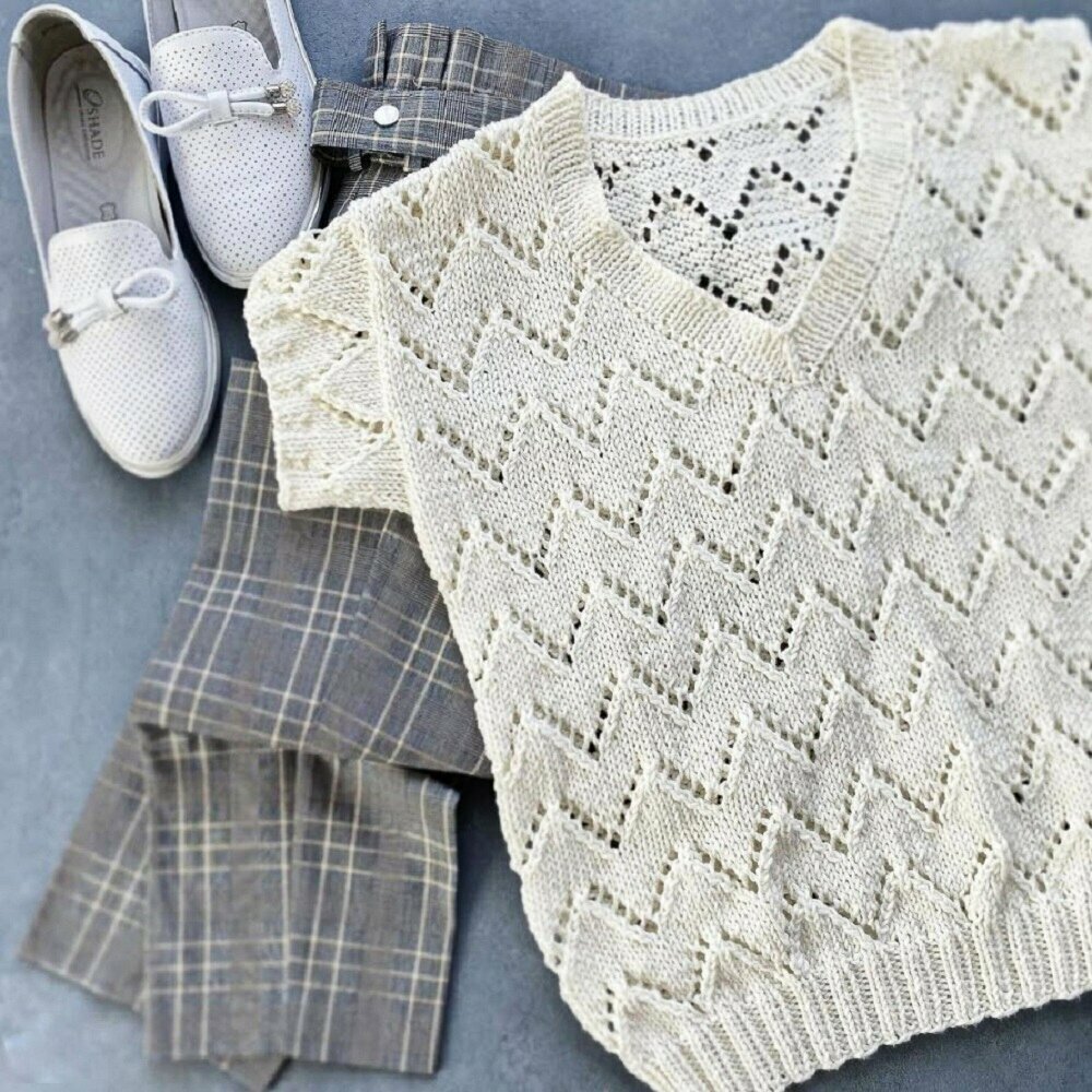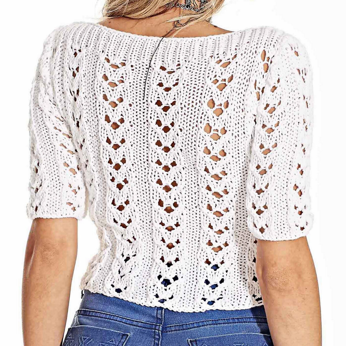 Белый топ с рукавами до локтя, слегка укороченный фасон, крупная вязка и простой узор из ажурных дорожек. Прямой фасон, втачной рукав и небольшой вырез лодочкой.