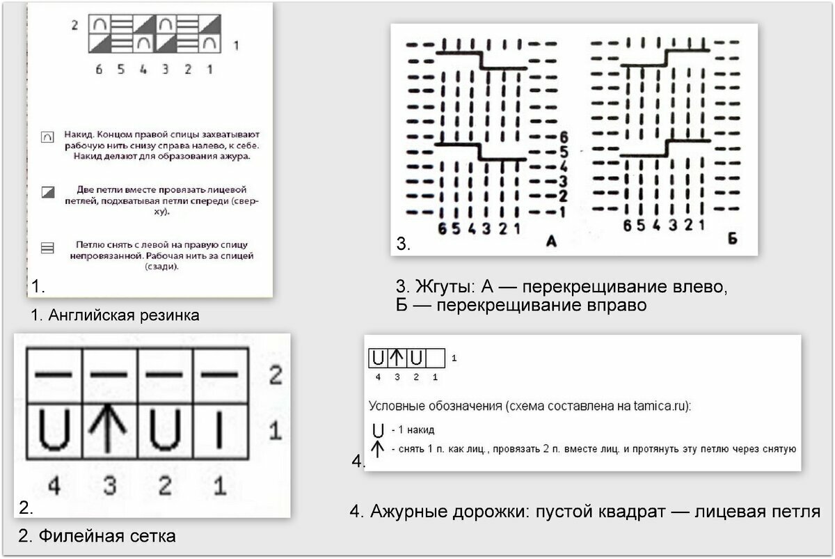 Здесь четыре несложных узора: по бокам идёт филейная сетка (не крючком, а спицами, но внешне похожа на филейку), затем жгуты с наклонами в разные стороны (одни вправо, другие влево), по бокам, в серединке, ажурные дорожки, и по центру топа — английская резинка.