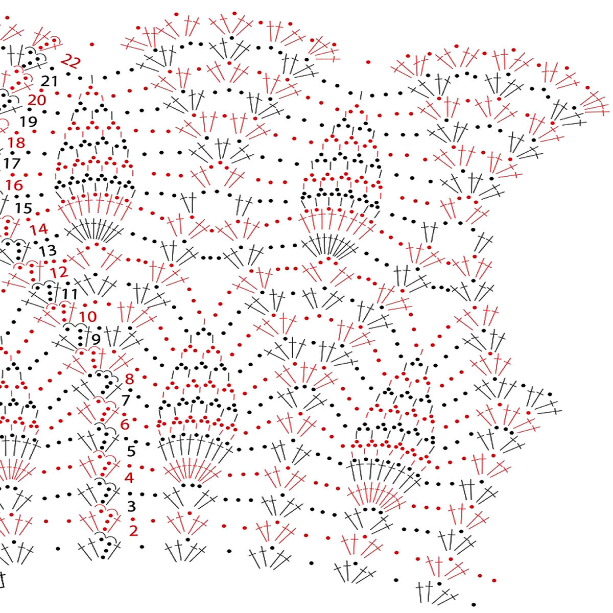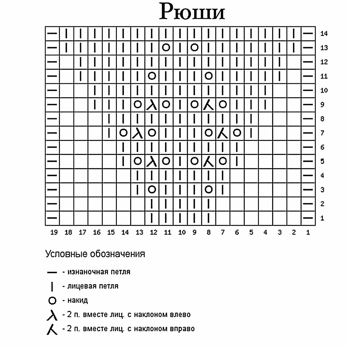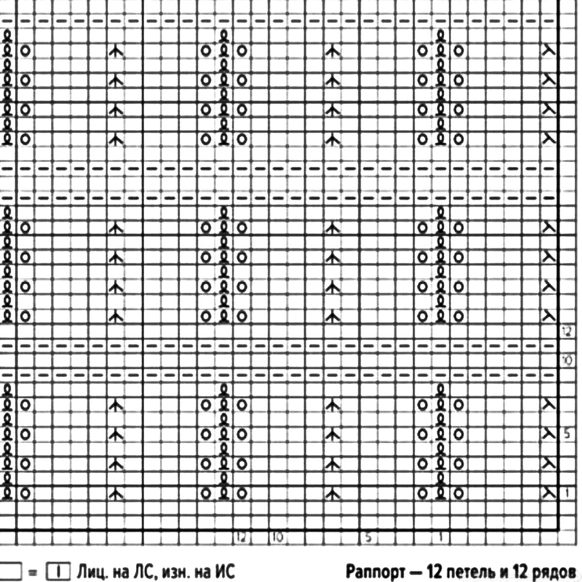 Раппорт узора 12 петель и 6 рядов в высоту. На схеме указаны только лицевые (нечётные) ряды, изнаночные (чётные) вязать изнаночными петлями. Рекомендуется добавить одну петлю к общему количеству раппортов — для красивой симметрии узора.