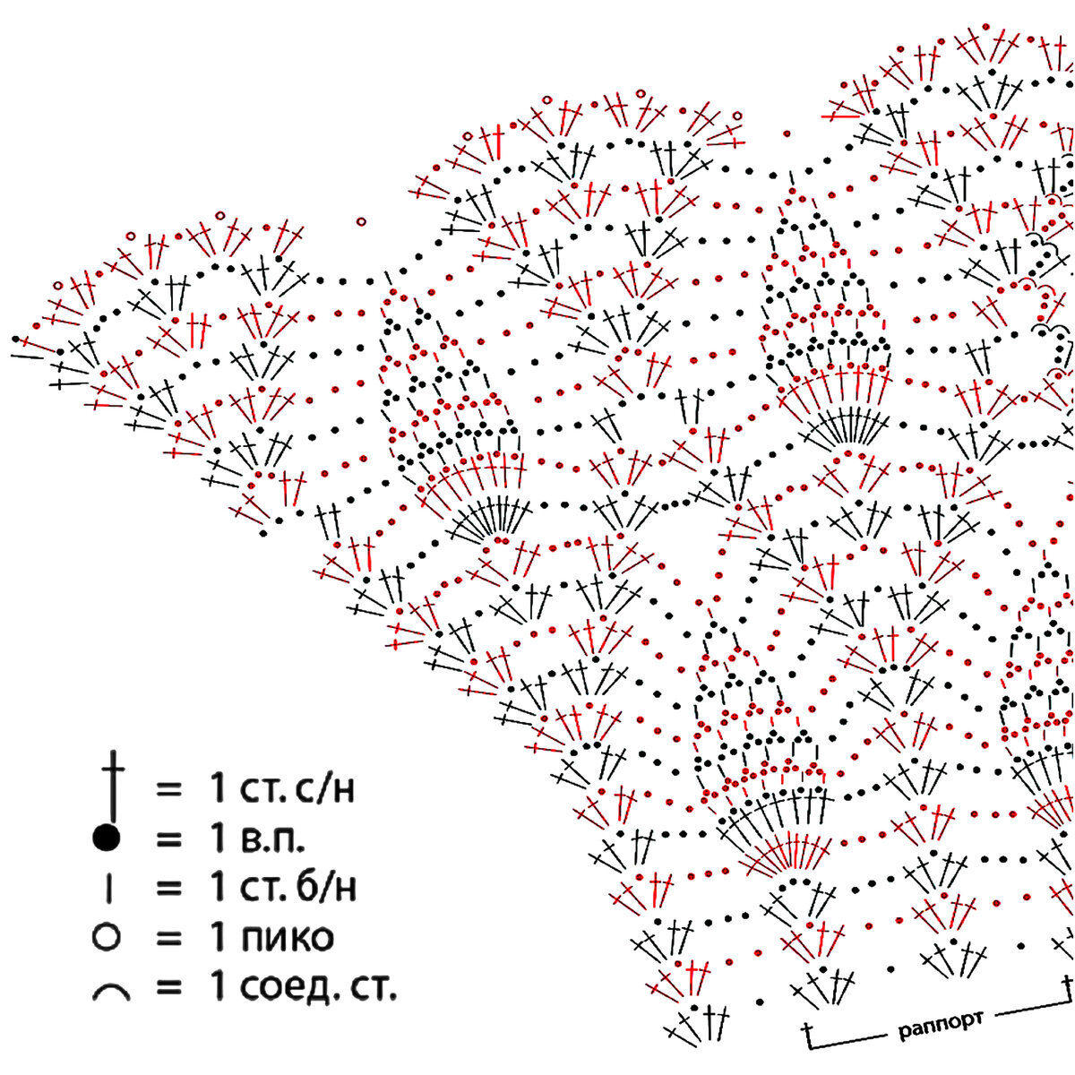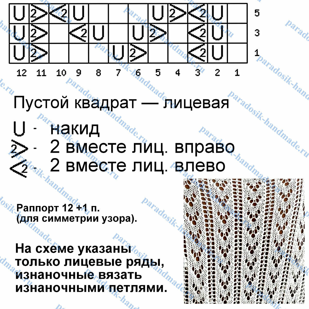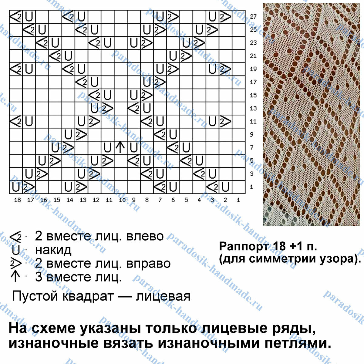 Основной ажурный узор очень прост в исполнении, с таким ажуром справится даже новичок. Красивые ажурные дорожки и галочки между ними.