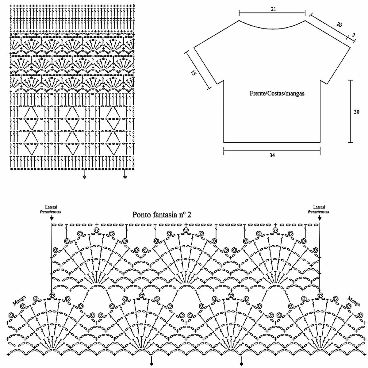 Связать такую футболку можно по кругу снизу (до ходим до пройм и разделяем вязание на перед и спинку, впереди вяжем V-образный вырез) либо поворотными рядами — отдельно перед, отдельно спинку и затем сшиваем.