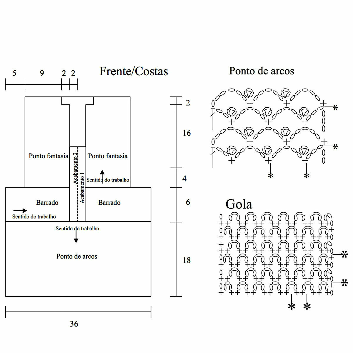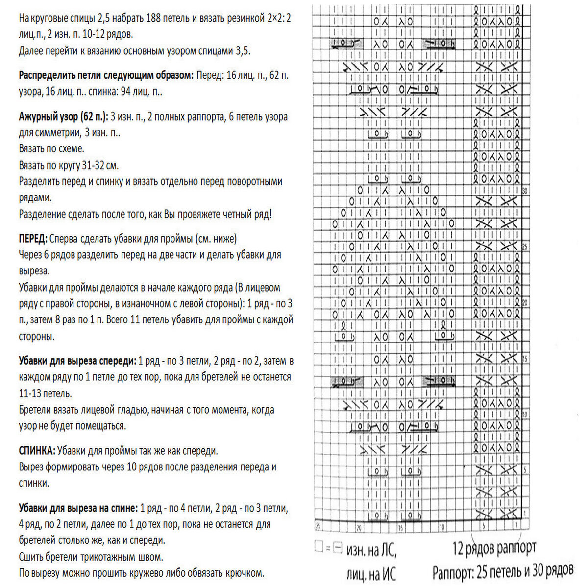 Далее вяжем до пройм основным ажурным узором (схему привожу ниже), затем отмечаем места под проймы и разделяем вязание на спинку и две передние части — вяжем каждую часть отдельно, плавно убавляя петли под проймы по типу V-образного выреза (можно в каждом ряду, можно только в лицевых — зависит от желаемой глубины пройм). Отделку пройм можно вязать как сразу с убавлением (резинка из снятые лицевых петель), так и надвязать вертикально после того, как изделие будет готово. Передние детали вяжем также с V-образным скосом для горловины.