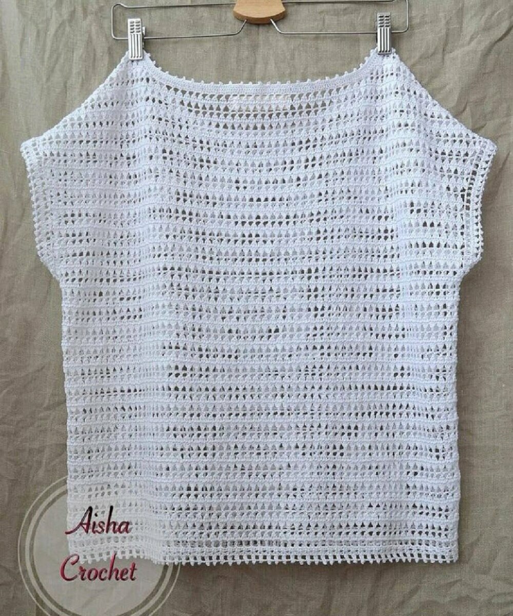 Этот белый топ свободного кроя из Бурды придётся по вкусу модницам, которые предпочитают модели оверсайз — воздушный узор, вырезы на плечах, небольшие разрезы в боковых швах и слегка удлиненная спинка.