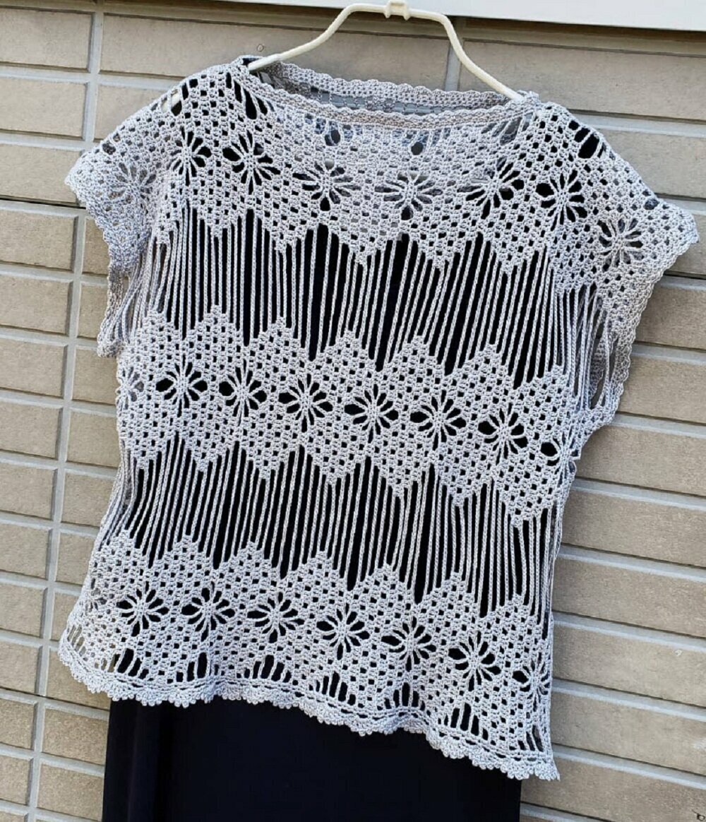 Оригинальный белый топ, связанный поперёк. Главная особенность этого топа — в длинных цепочках, которые красиво вытягиваются под весом основного узора. А чтобы узор выглядел именно так, модель необходимо вязать поперёк, вот и весь секрет.