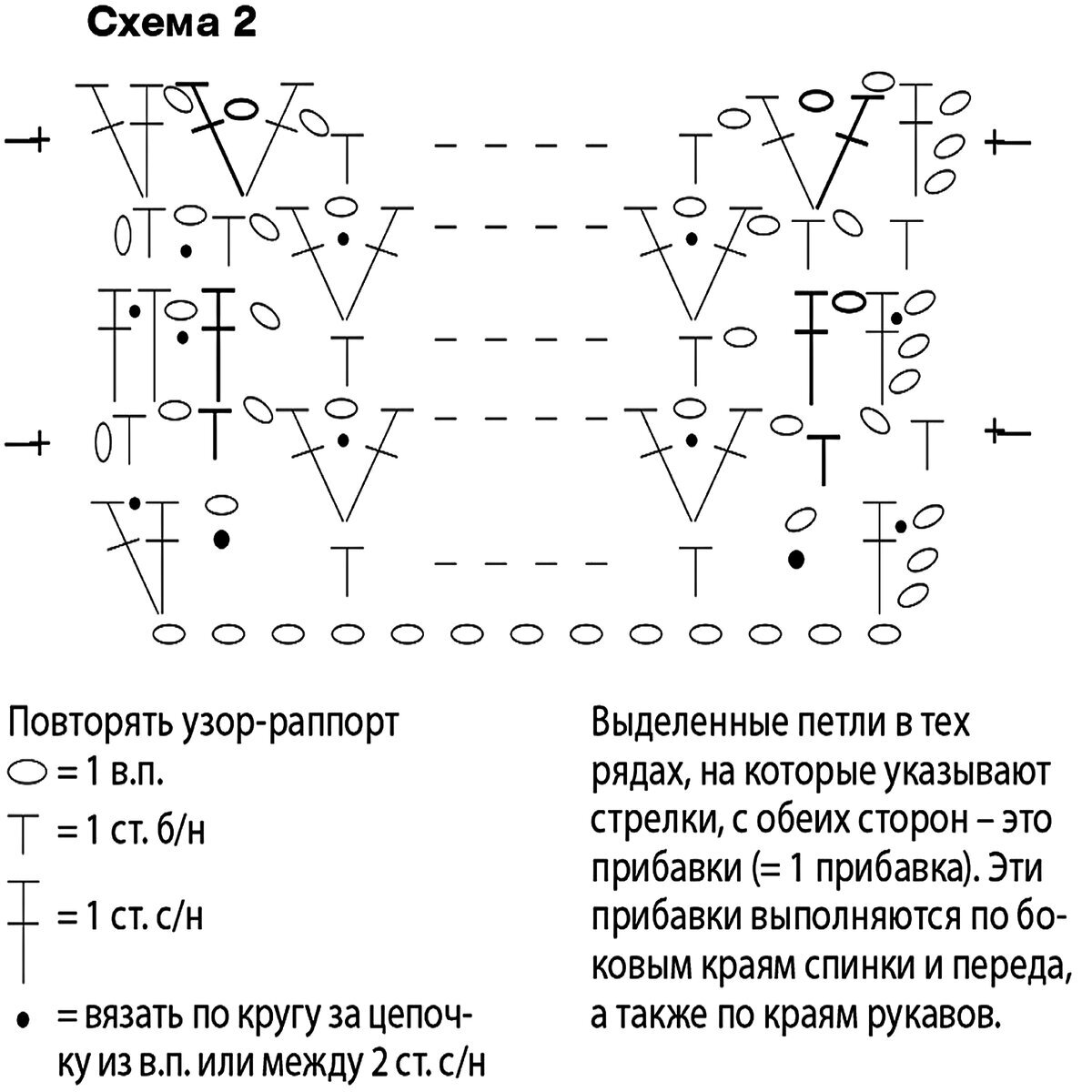 Раппорт ажурного узора (Схема № 2) 8 петель и 12 рядов в высоту. На схеме указаны и лицевые (нечётные), и изнаночные (чётные) ряды.
