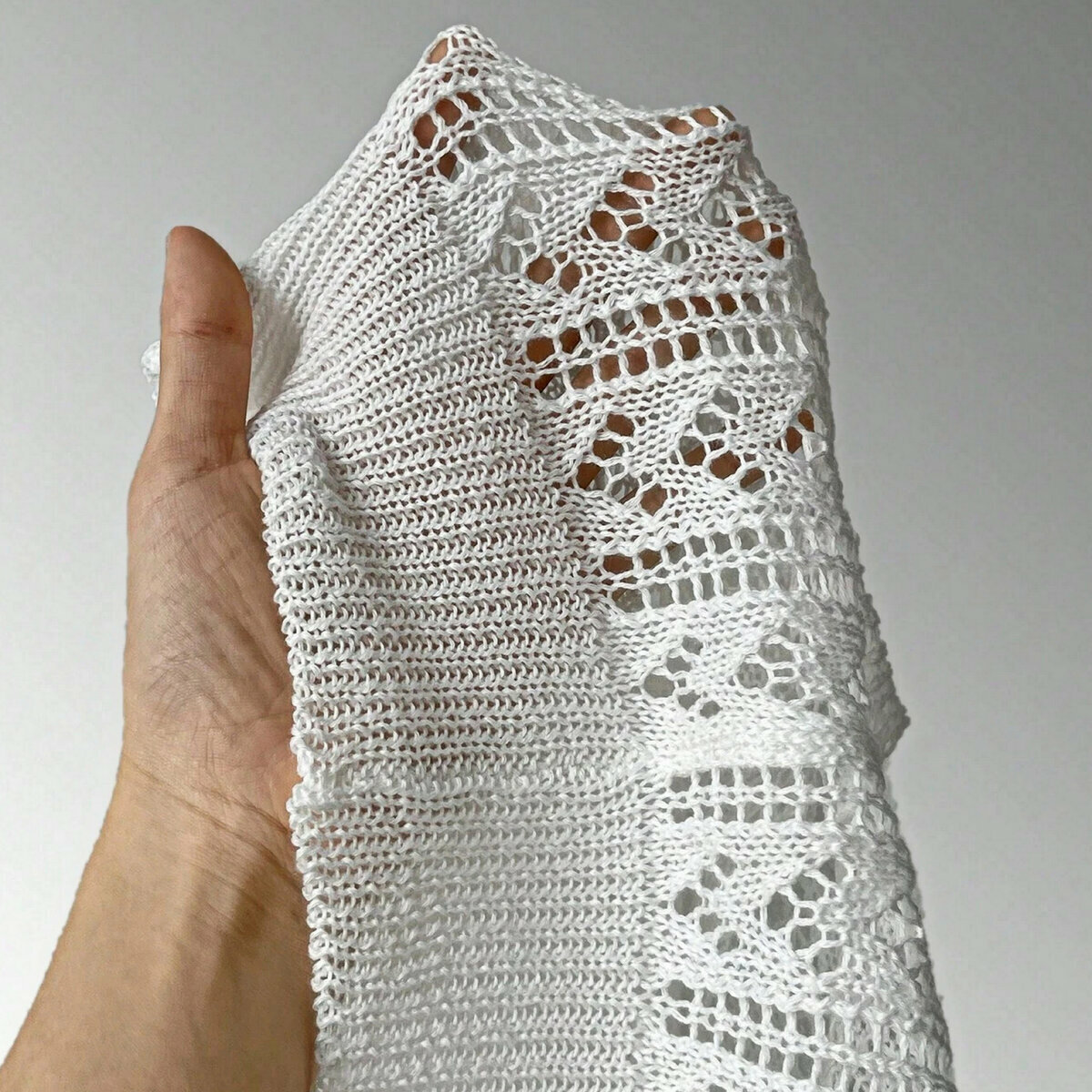 Нежный белый топ свободного кроя. Удлинённый фасон, спущенная линия плеча и вырез лодочкой. Воздушная туника с красивым ажуром, которая одинаково хорошо будет смотреться и с джинсами, и с юбками.