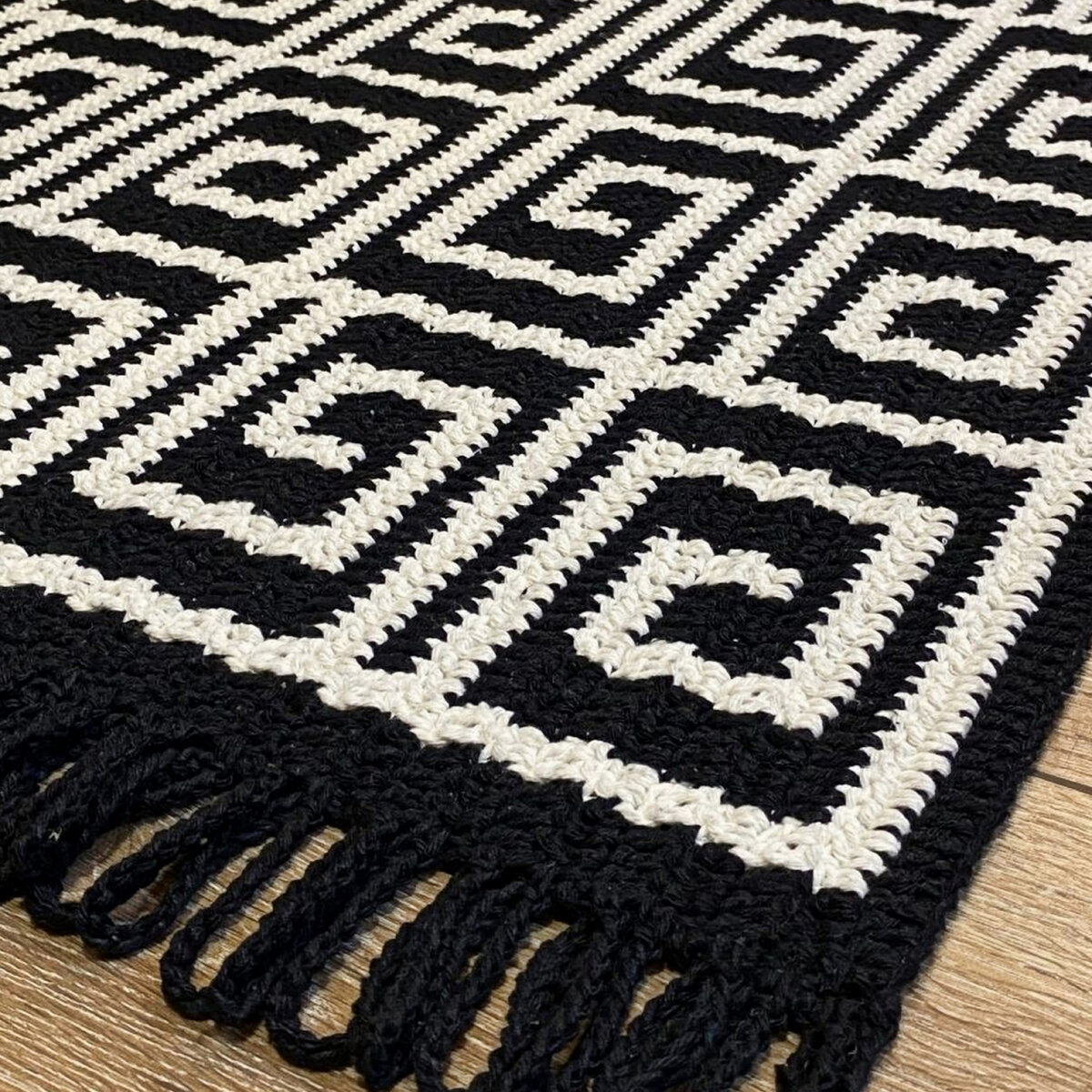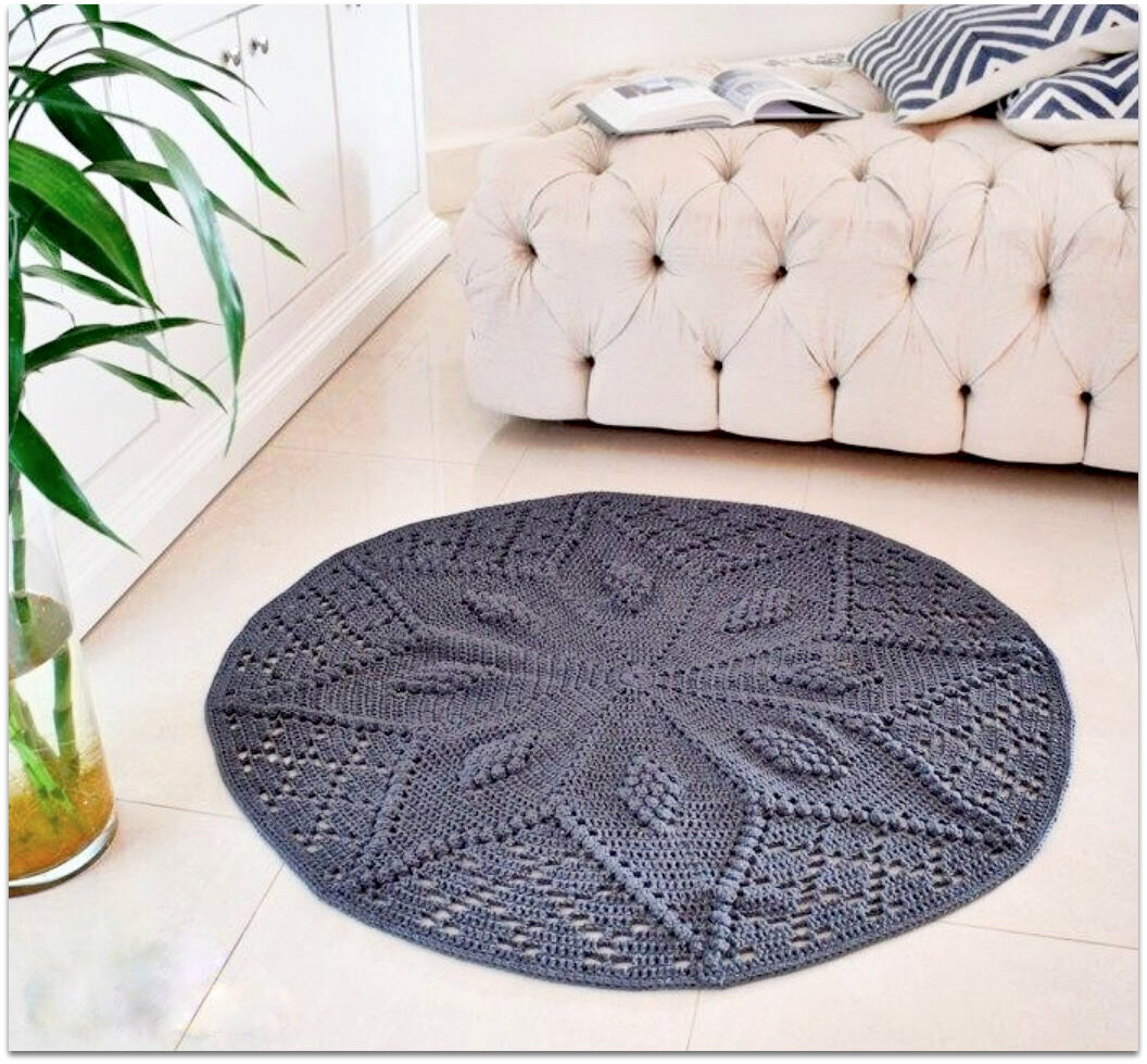 А такие ковры можно нередко увидеть в интернет-магазинах по весьма приличной цене (в смысле — дорого). Смотрятся они стильно и современно… но зачем покупать, когда можно связать? Ничего сложного в этом ковре нет, основные элементы — столбики с накидом и попкорн.