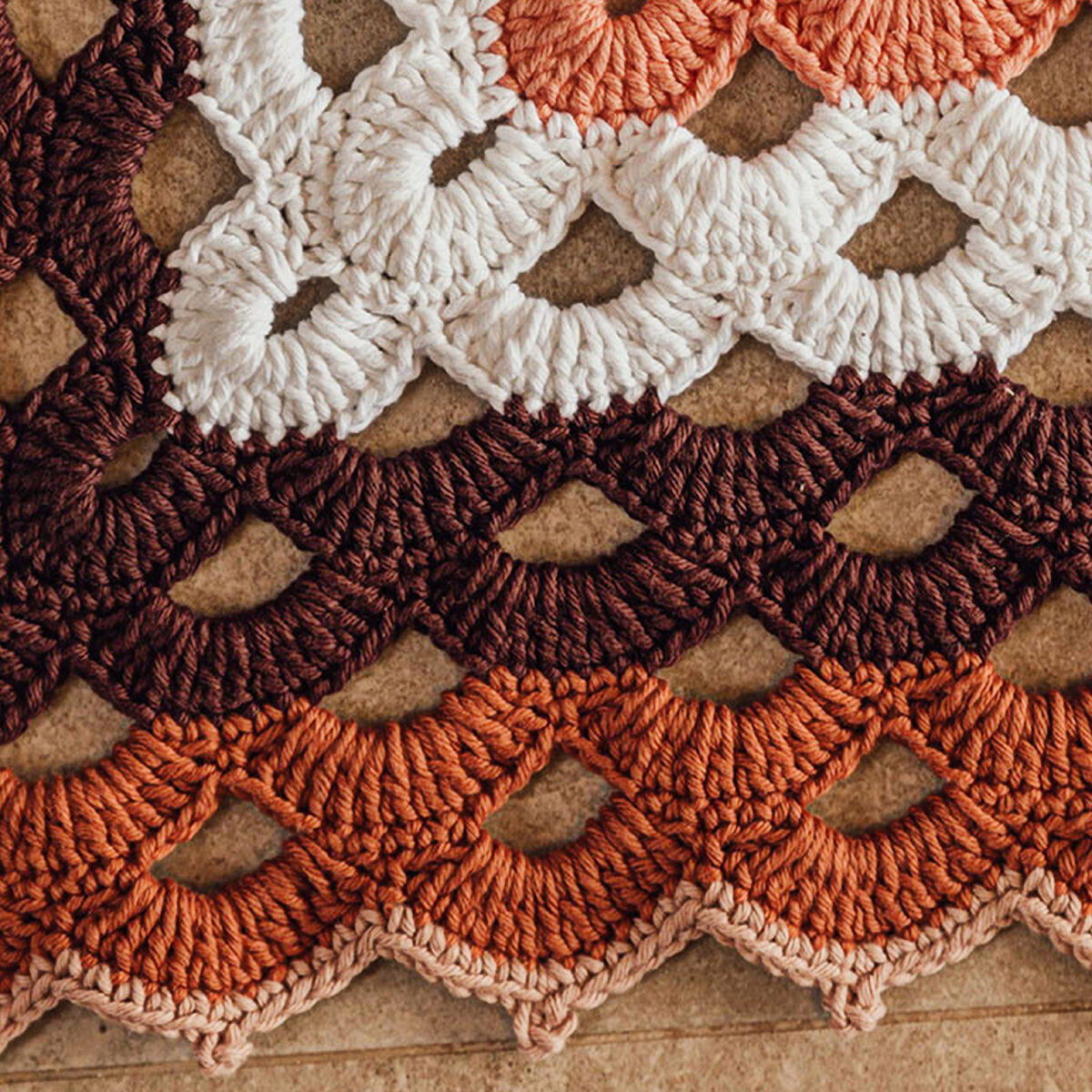 Нам понадобится по 2 мотка терракотовой, коричневой, белой и коралловой пряжи — на размер 150 х 85 см: 100% мерсеризованный хлопок; 100 гр — 115 м. Крючок № 3-3,5.
