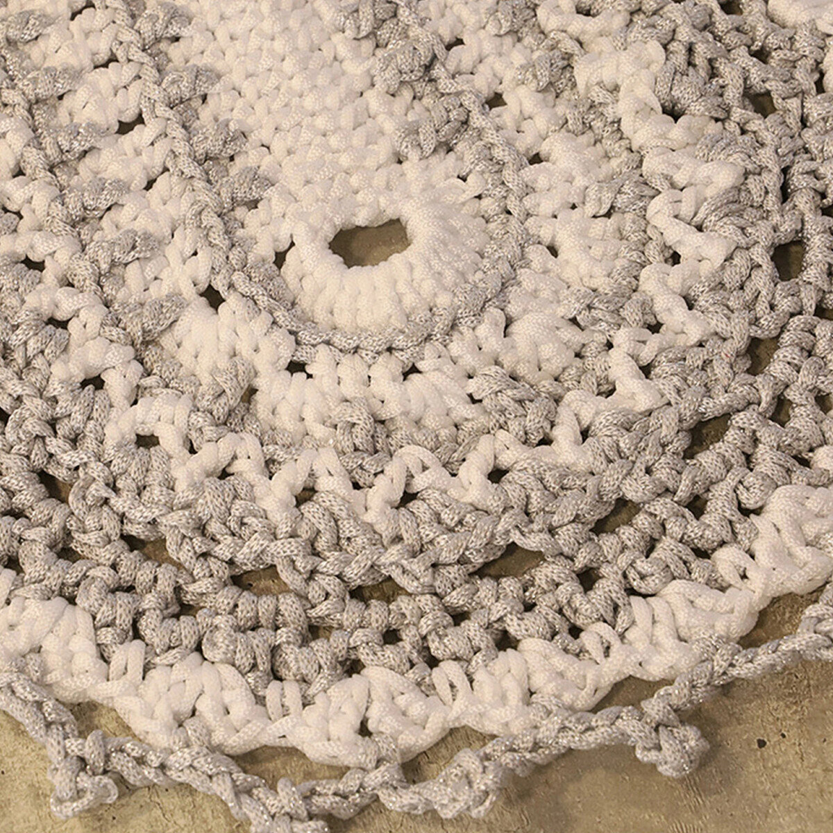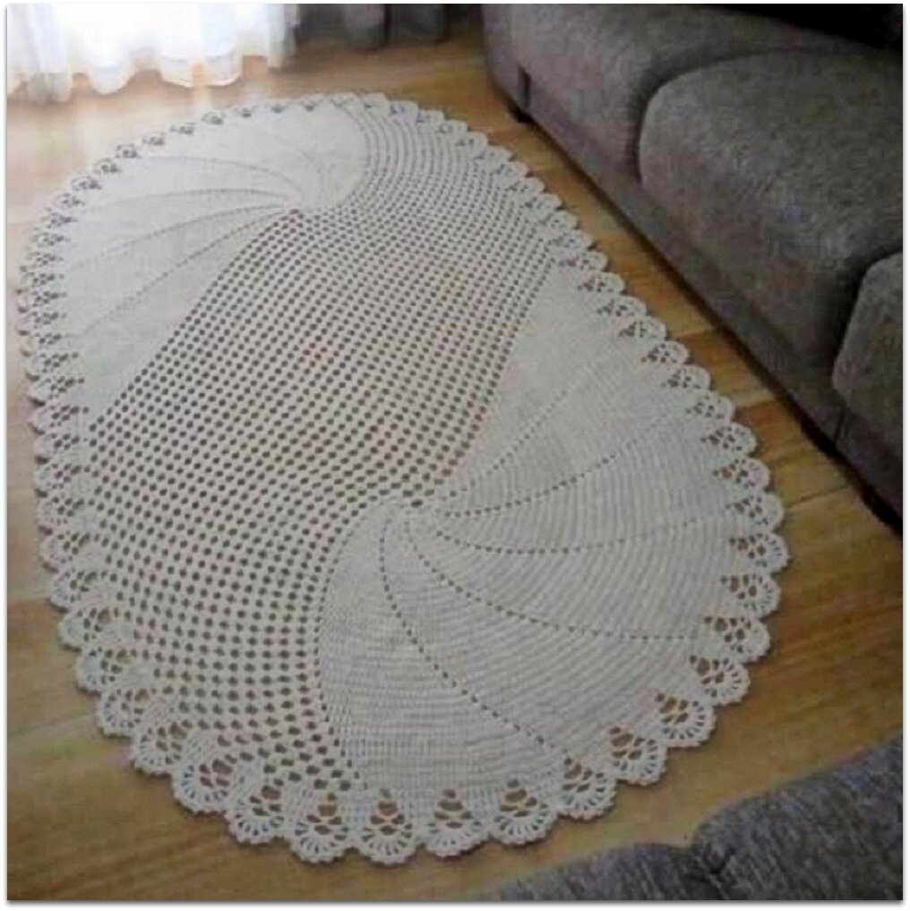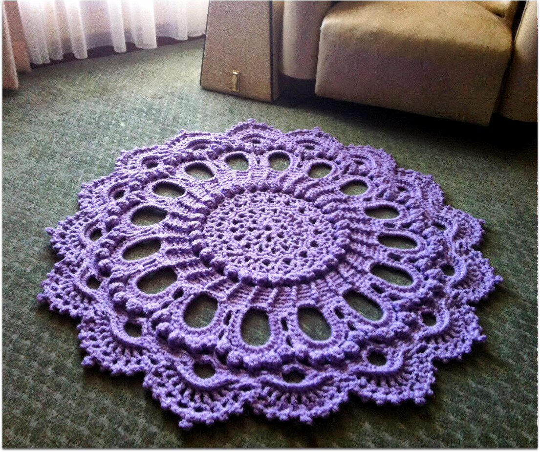 Этот ковёр напоминает большую ажурную салфетку, но это не отменяет того факта, что смотрится такой ковёр очень красиво и уютно. Единственное, что меня смущает — это цвет. Бесспорно, белый ковёр выглядит шикарно… но как быстро он из белого превратится в грязно-серый с бурыми пятнами? Особенно, если в доме есть животные и дети. Можно попробовать связать менее броский (но не менее эффектный) вариант в коричнево-бежевой гамме. Ну или в любой другой, подходящей под ваш интерьер.