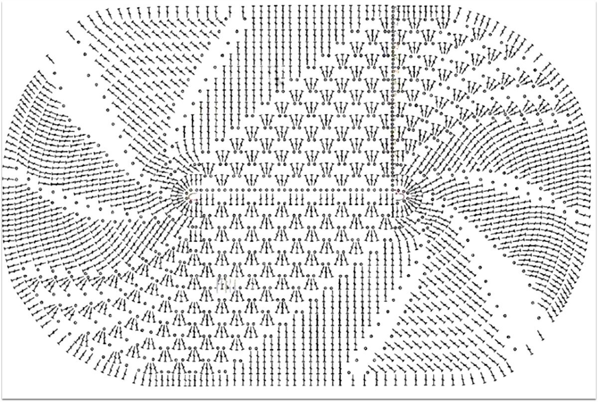 Овальный ковёр с несложным геометрическим рисунком. На схеме нет окантовки по краю — можно подобрать её самостоятельно или связать без неё — выйдет не хуже. Как по мне, без ажурной отделки ковёр будет смотреться более современно и стильно. Как говорится, лучшее — враг хорошего.