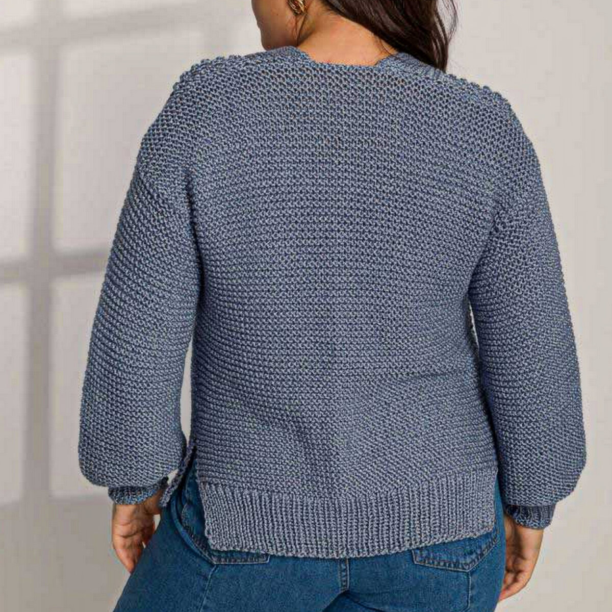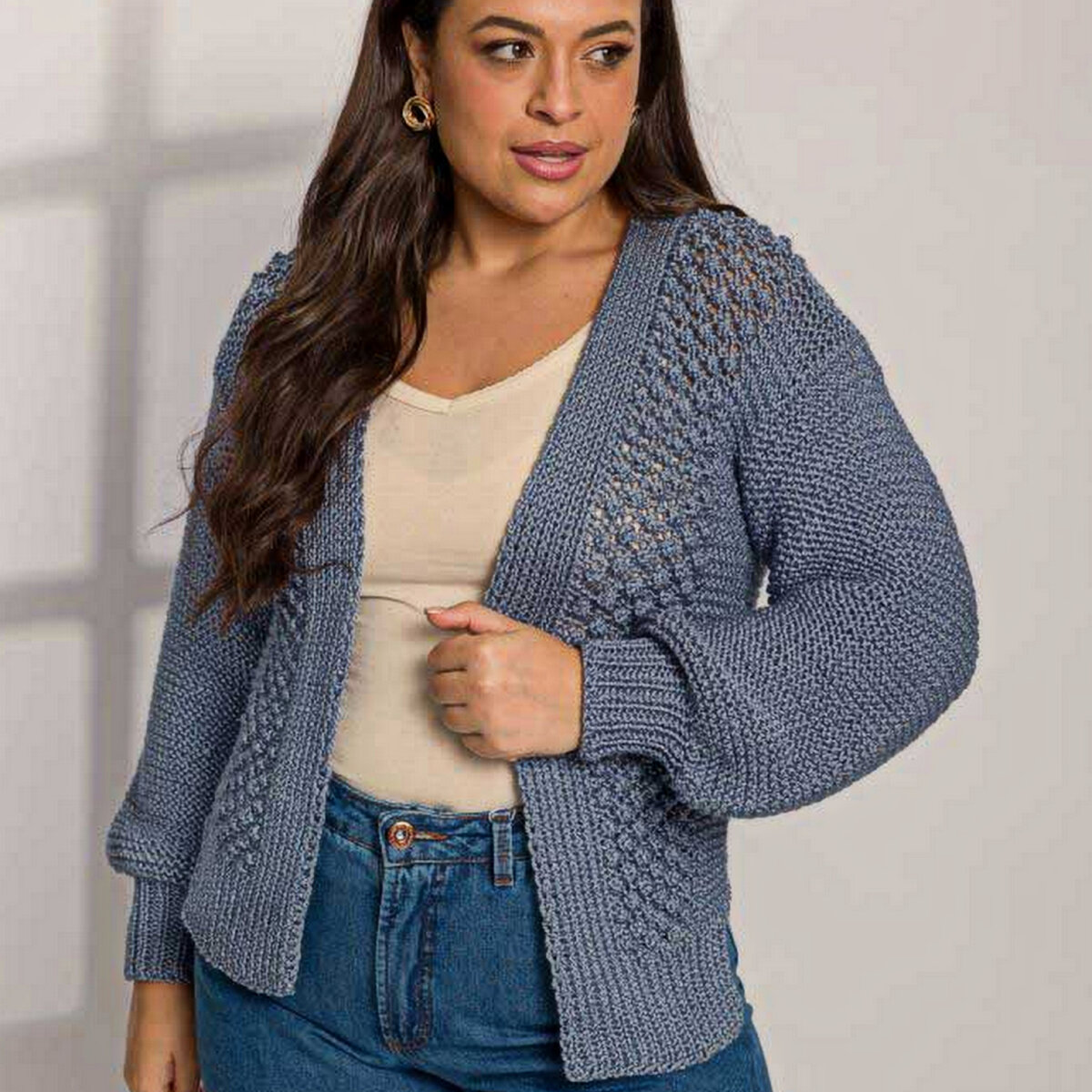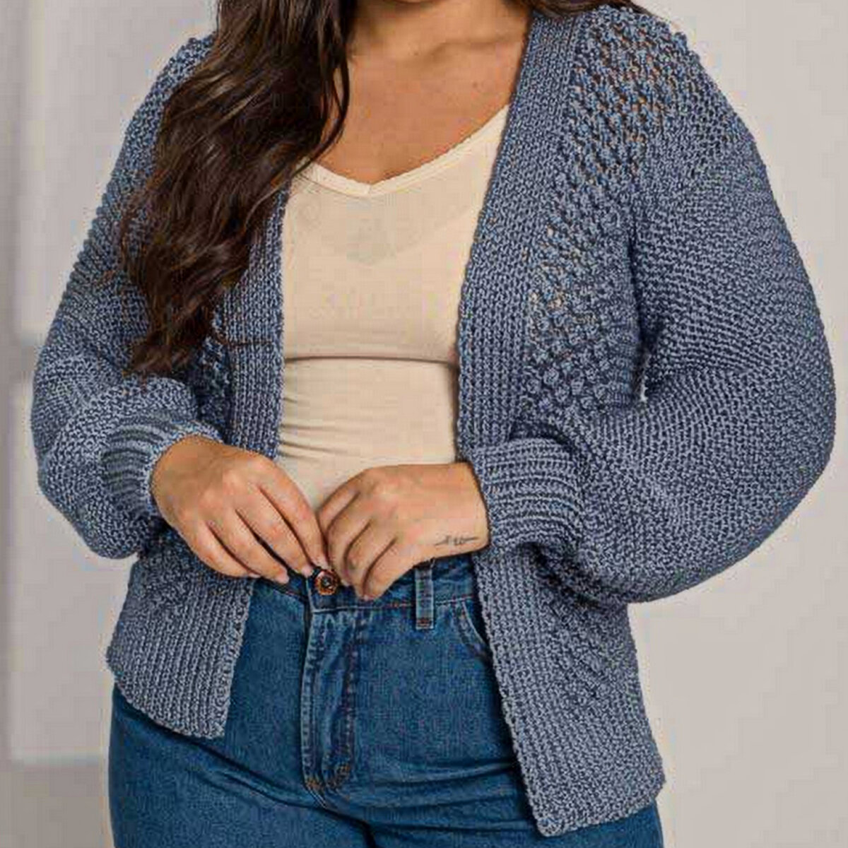 Дымчато-синий кардиган спицами. Прямой крой, слегка спущенный рукав и боковые разрезы. Если не хочется добавлять объёма изделию, можно заменить платочку, которая идёт на рукавах и спинке, на изнаночную гладь.