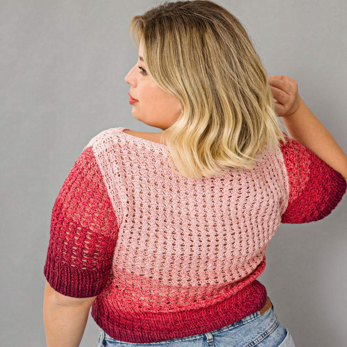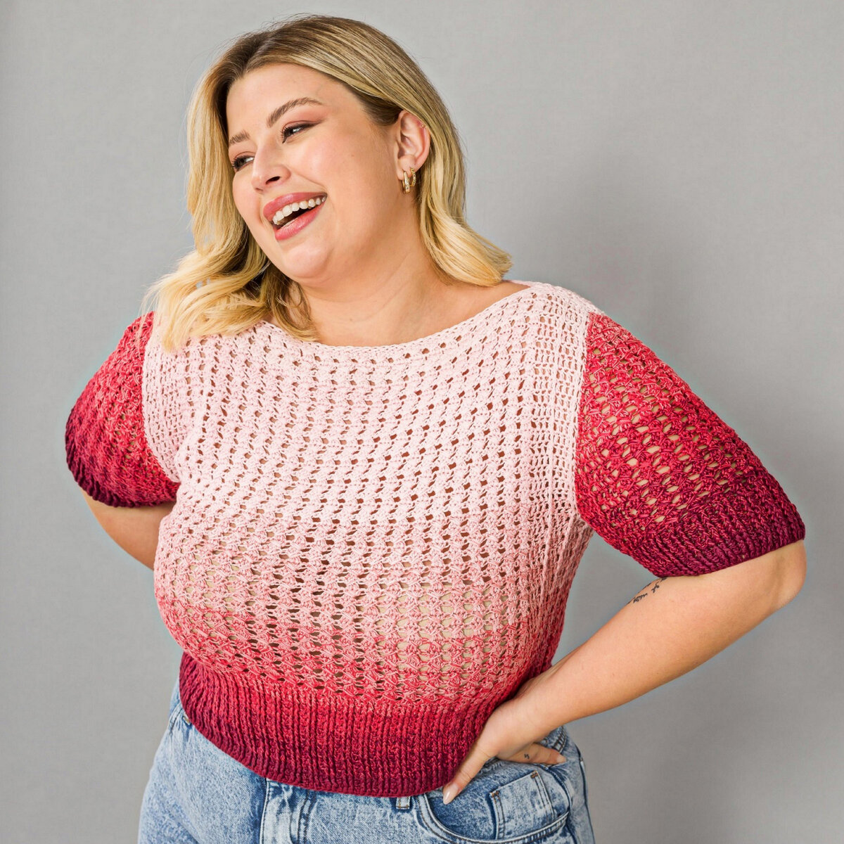 Яркий топ из секционной пряжи крючком. Прямой фасон, вырез лодочкой, втачной рукав выше локтя.