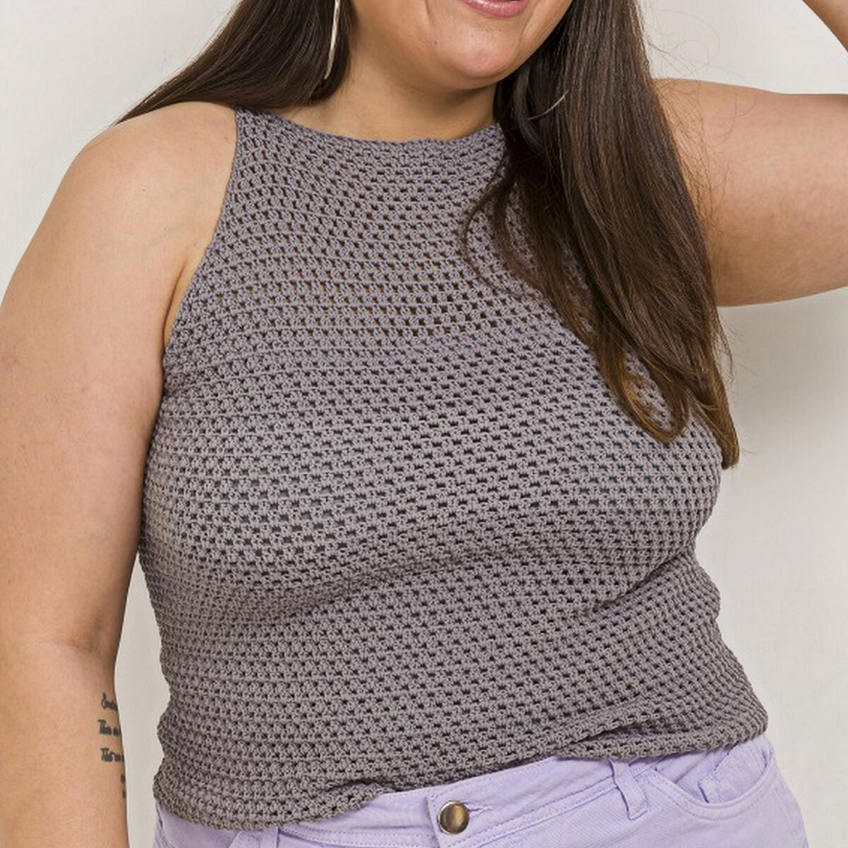Лаконичный серый топ крючком. Модель без рукавов, прямого кроя, небольшой круглый вырез горловины, глубокие проймы с V-образным скосом.