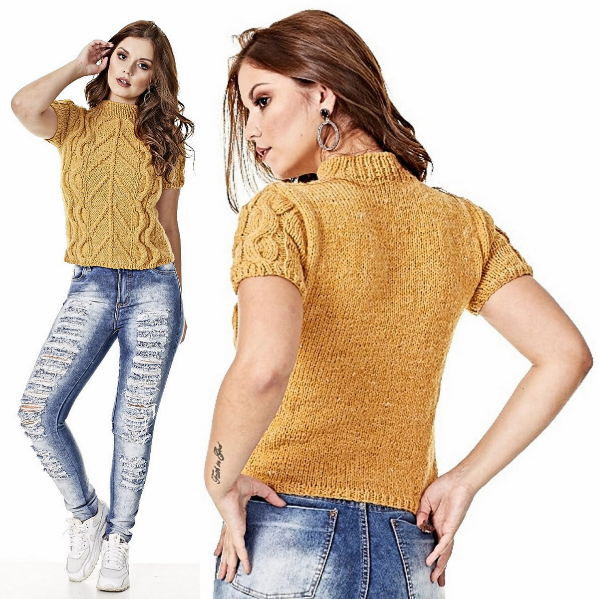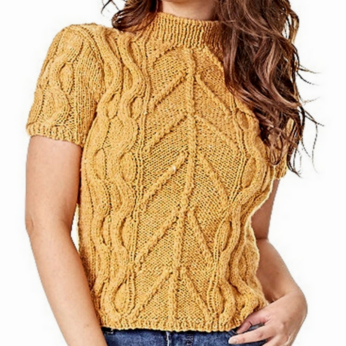 Горчичный свитер с коротким рукавом. Интересный центральный узор ёлочкой из мелких жгутов и крупные косы по бокам. Прямой фасон до талии, короткий втачной рукав и ворот-стойка.