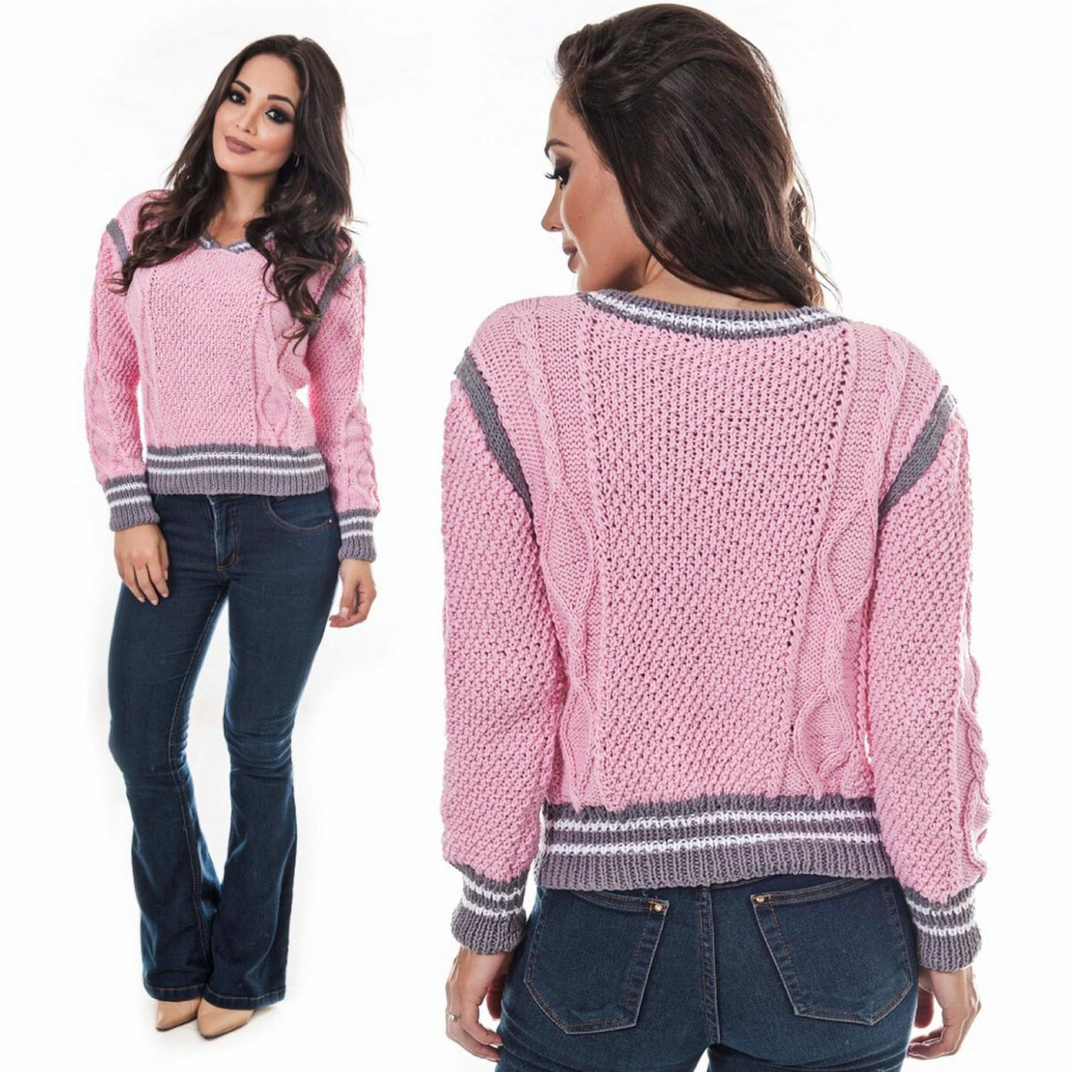 Розовый пуловер с бело-серыми вставками. Универсальная модель в спортивно-повседневном стиле. Прямой фасон до пояса, втачной рукав и небольшой V-образный вырез горловины.