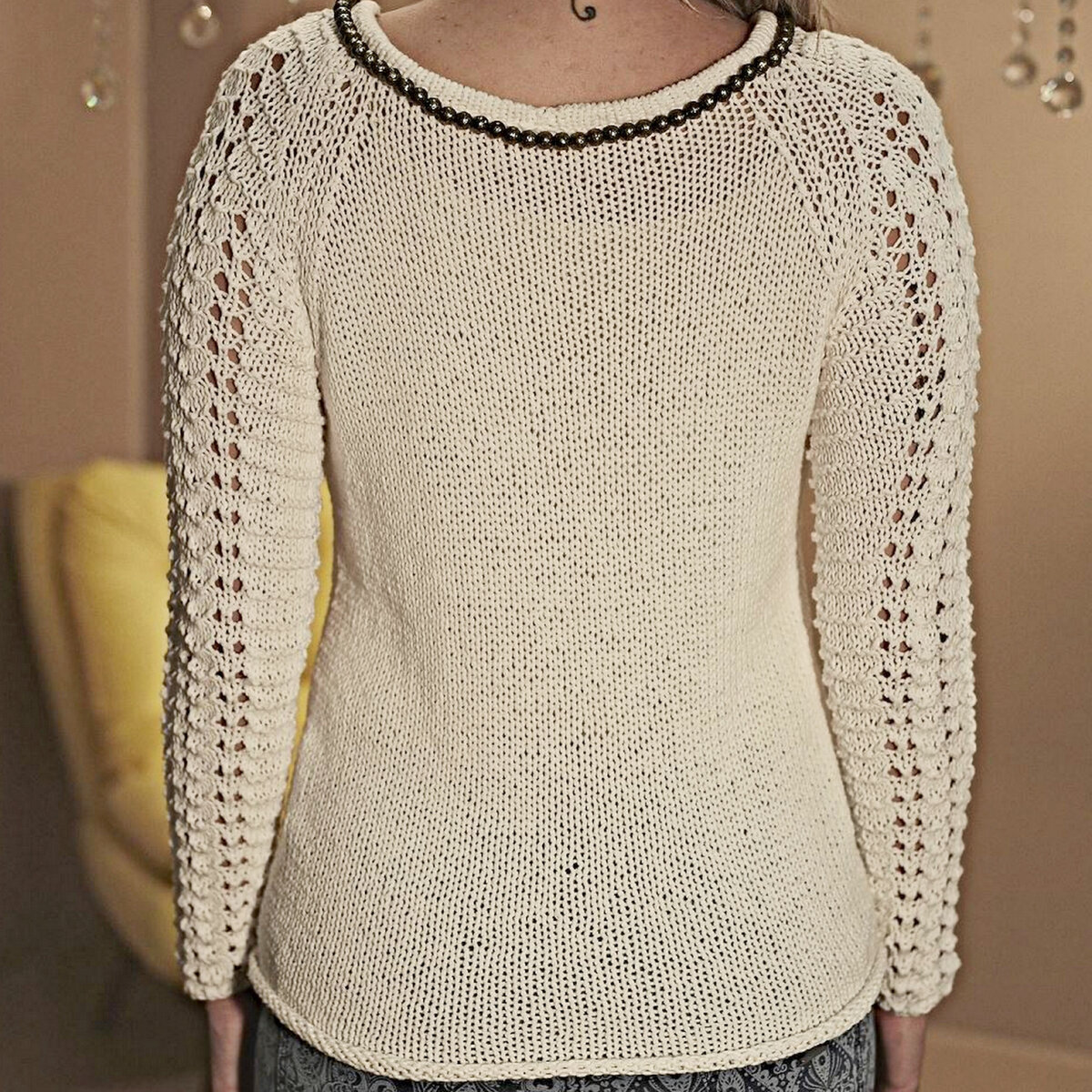 Элегантный белый джемпер с ажурными рукавами и круглым воротом, украшенным перламутровыми бусинами. Прямой фасон ниже пояса, узкие рукава-реглан и широкий круглый вырез горловины.