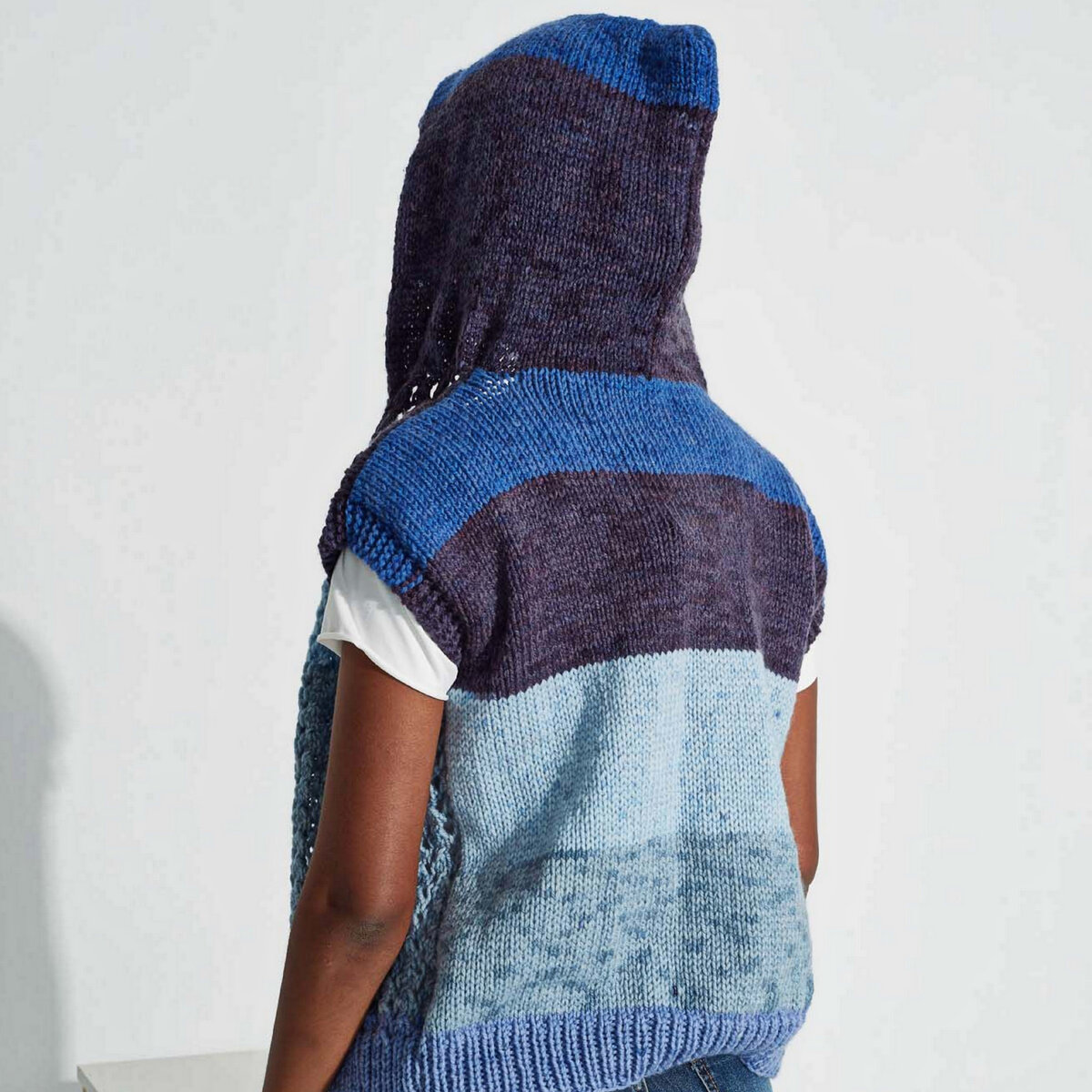 Полосатый жилет с капюшоном. Модель в спортивном стиле — перед связан ажурным узором, спинка и капюшон — лицевая гладь. Прямой фасон чуть ниже пояса, спущенная линия плеча.
