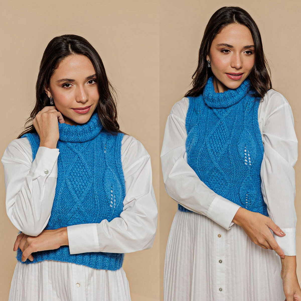 Укороченный ярко-бирюзовый жилет с объёмным воротом. Прямой фасон до талии, глубокие проймы, круглый вырез горловины. Ажурные листики хорошо сочетаются с рельефными ромбами.