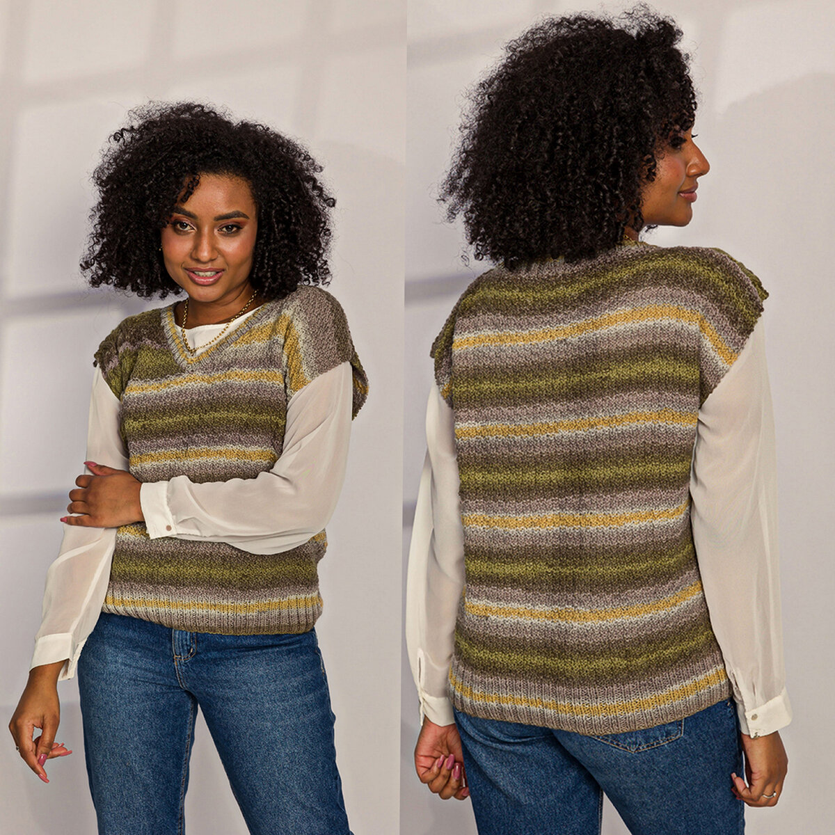 Мне нравится сочетание тонкой шифоновой блузы и объёмного жилета!