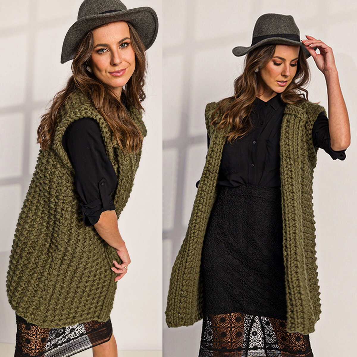 Удлинённый жилет цвета хаки очень крупной вязки. Простой узор из лицевых и изнаночных петель приобретает особую фактурность за счёт объёмной пряжи!