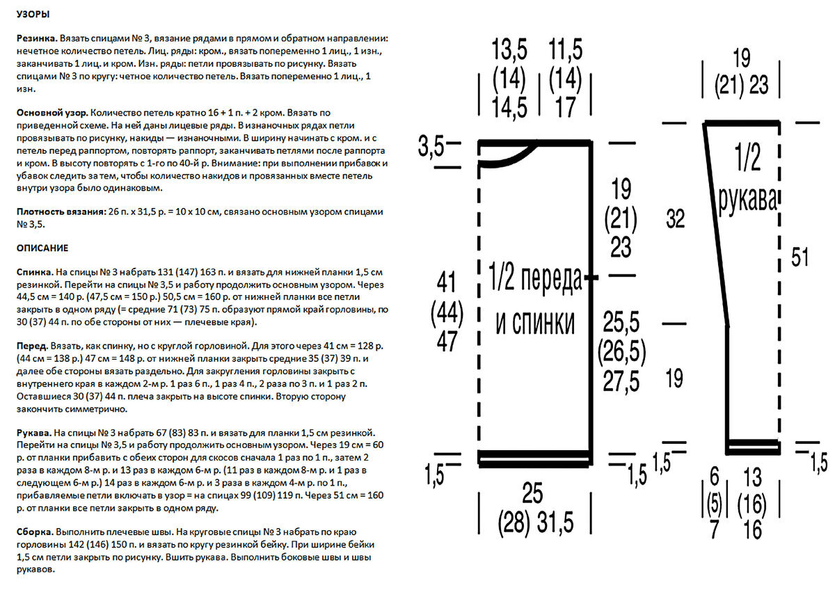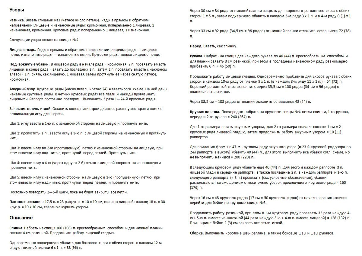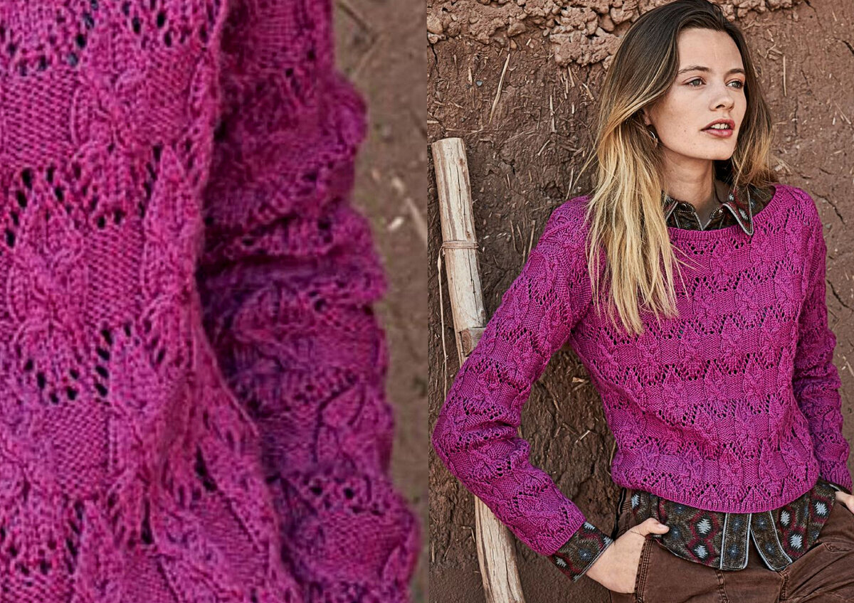 Для вязания этого джемпера нам понадобится 400 (450) 500 гр — на размеры 36/38 (42) 46/48 соответственно — пряжи цвета цикламена: 90% овечья шерсть, 10% кашемир; 50 гр — 160 м. Спицы № 3 и 3,5, а также круговые спицы № 3.