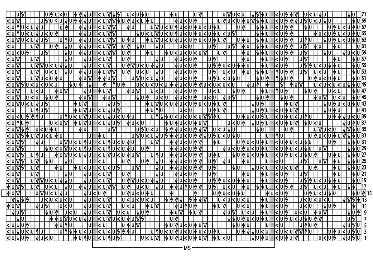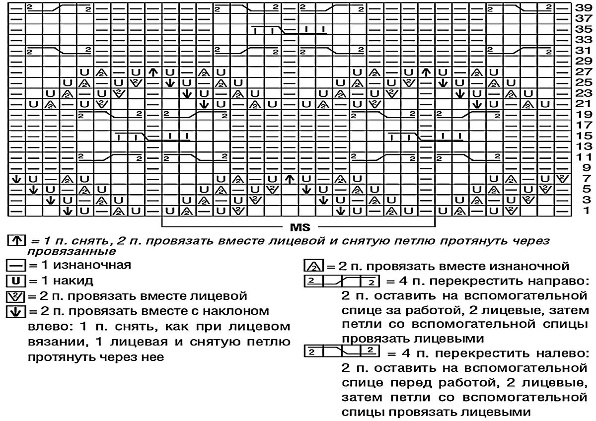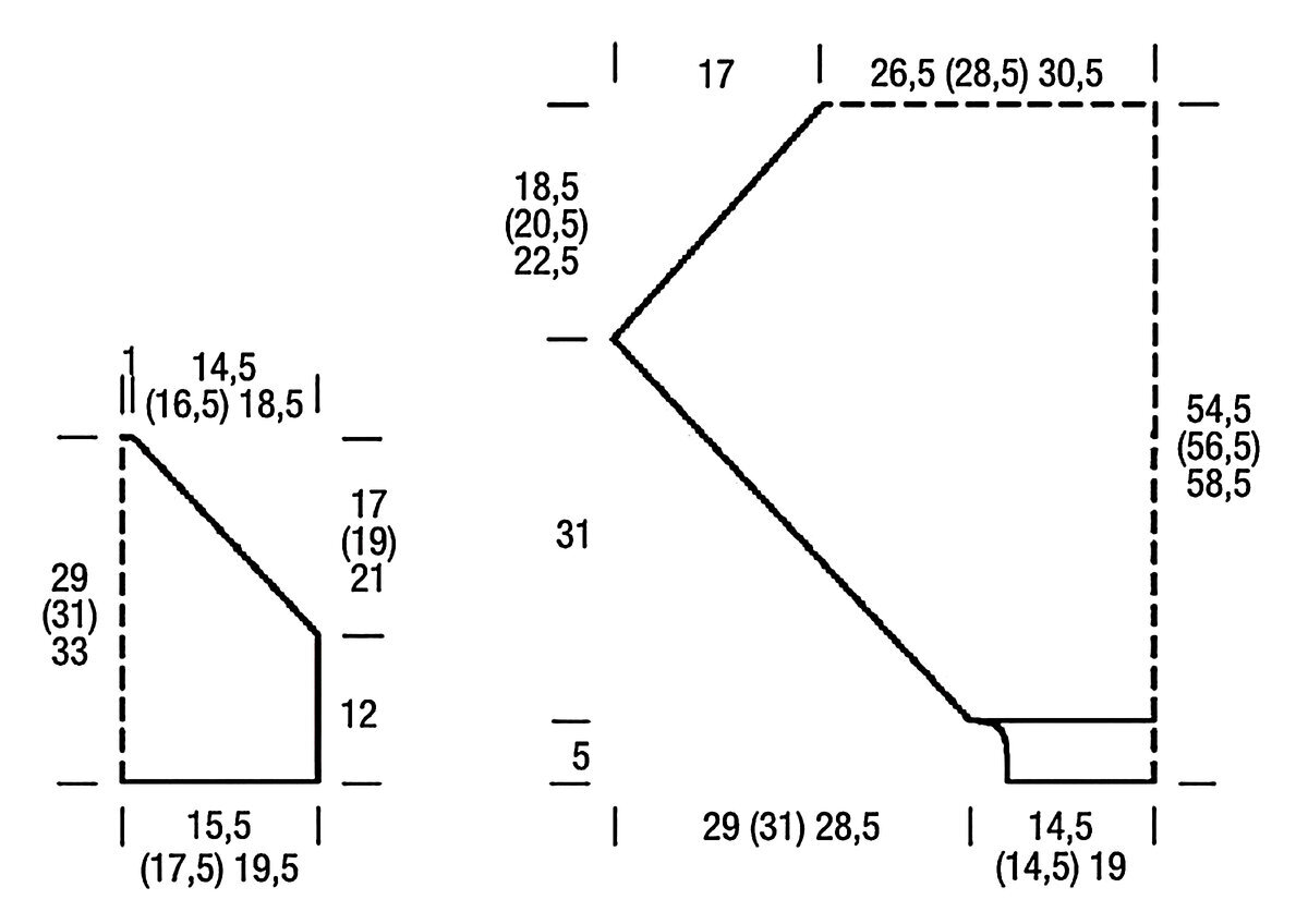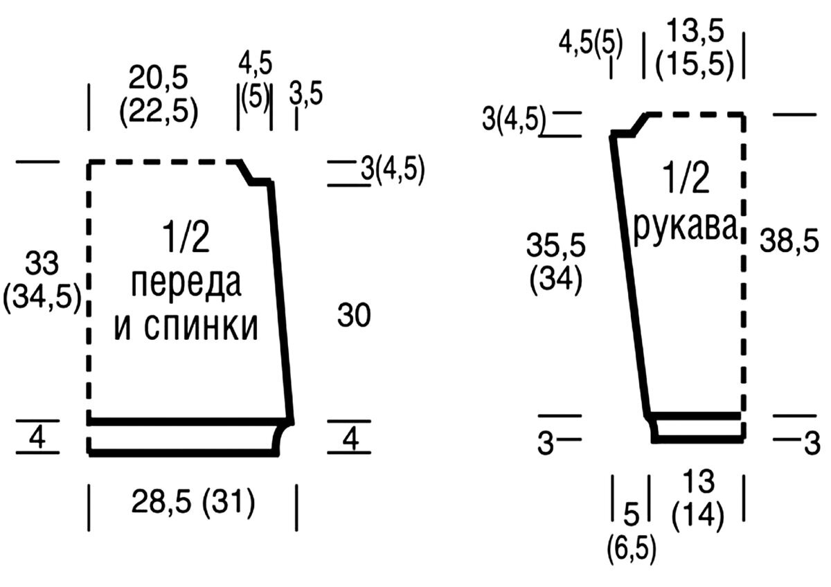 Для вязания этого джемпера нам понадобится 400 (450) 500 гр — на размеры 36/38 (42) 46/48 соответственно — пряжи цвета цикламена: 90% овечья шерсть, 10% кашемир; 50 гр — 160 м. Спицы № 3 и 3,5, а также круговые спицы № 3.